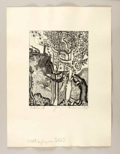 1969. Lithografie / Federlithografie, in Punktiermanier, in Schwarz, auf hartem hellchamois Velin. – Originale Künstlergrafik, von Hermann Naumann. – Probedruck. – 26,8 x 21,2 cm (Darstellung / Druckbild), 50 x 38 cm (Blatt).