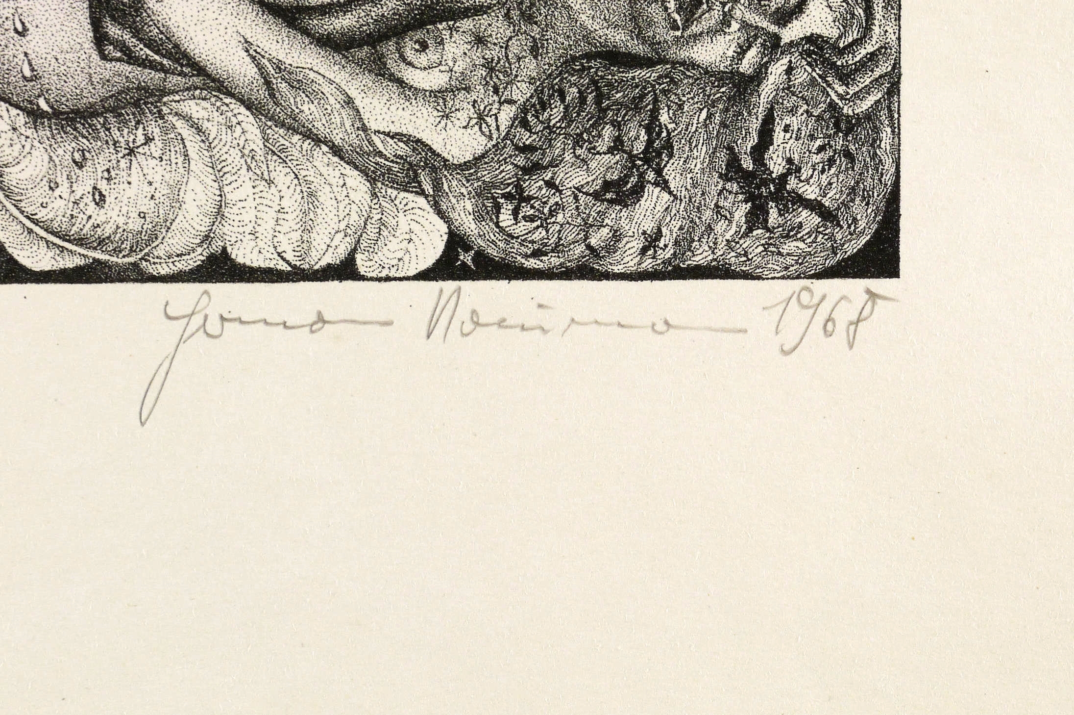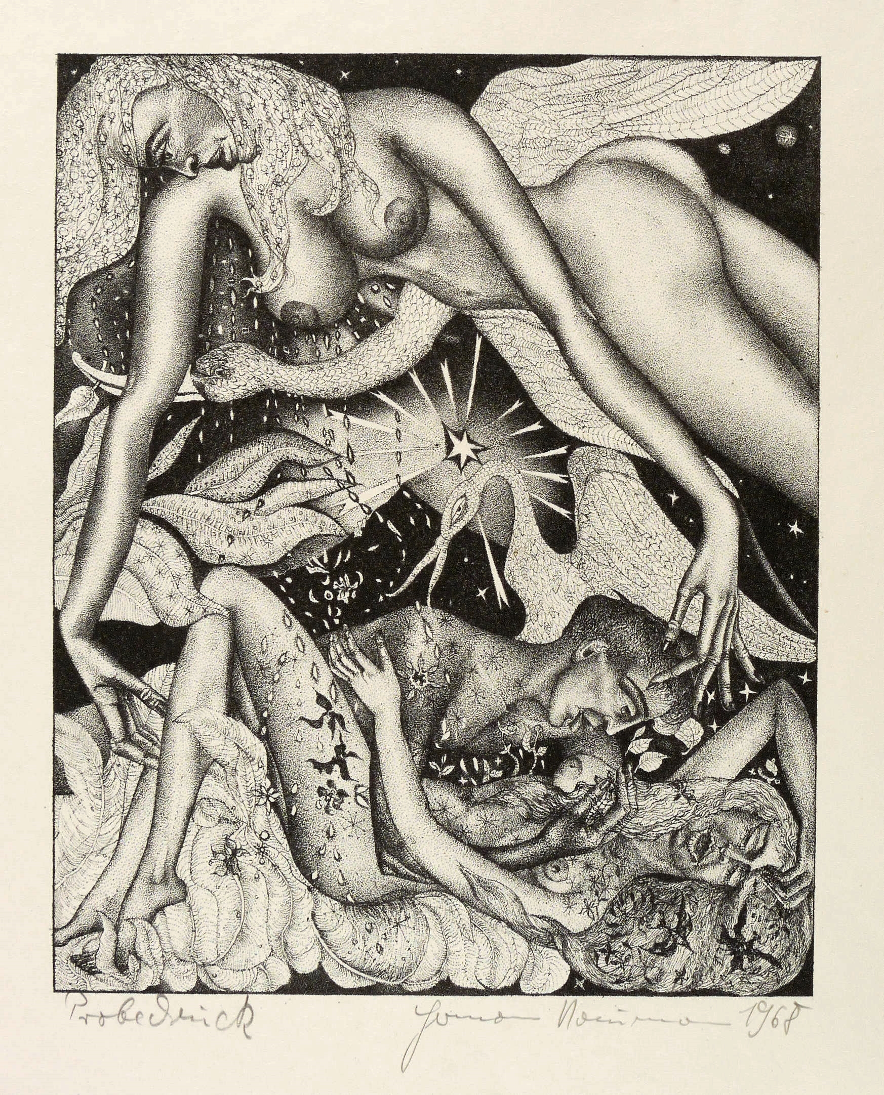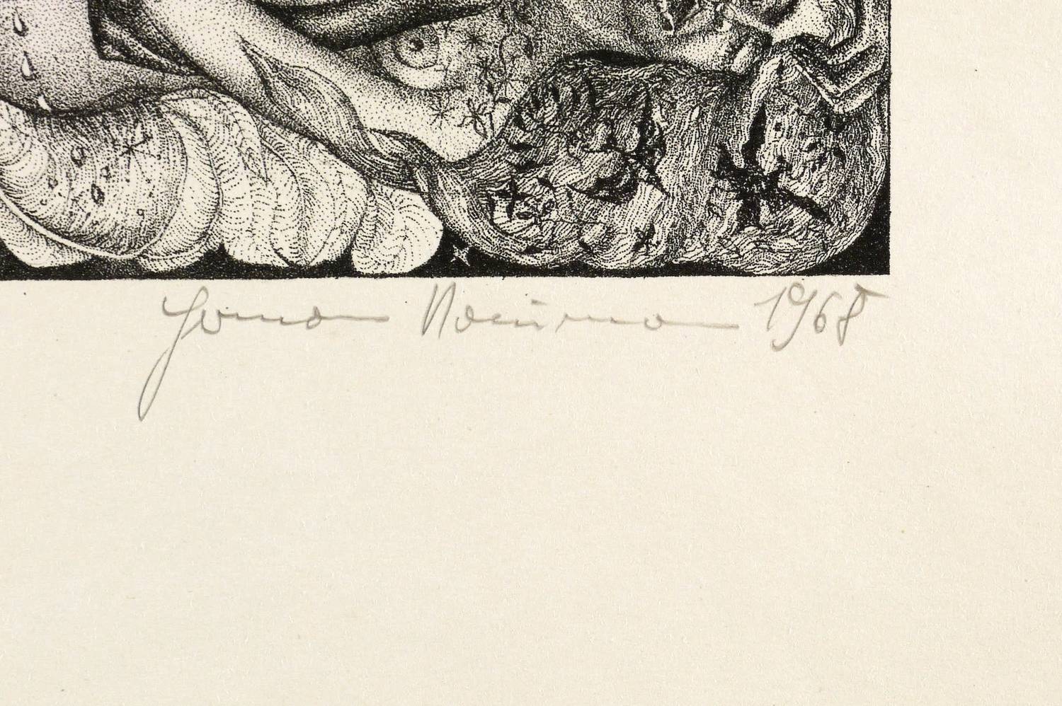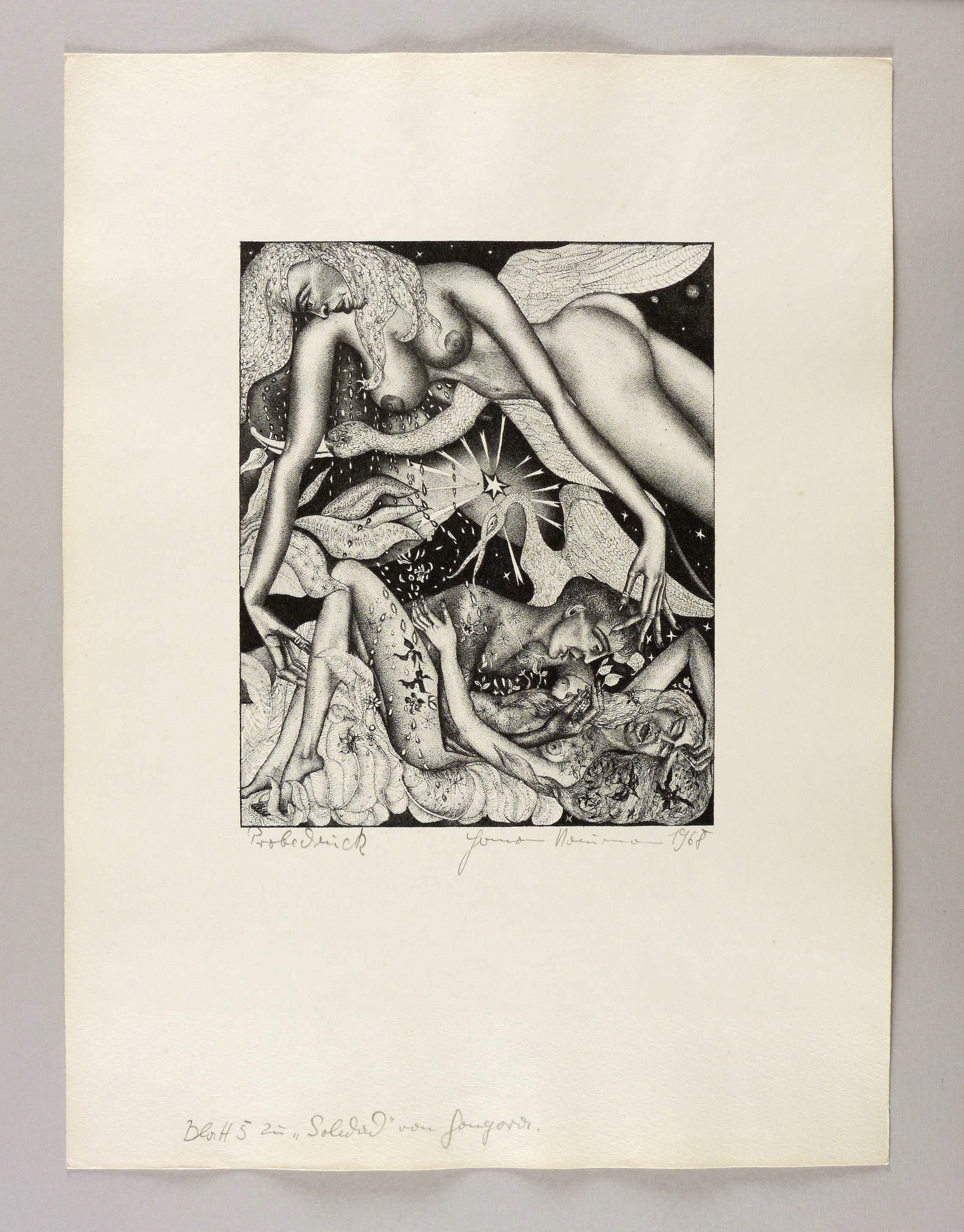 1968. Lithografie / Federlithografie, in Punktiermanier, in Schwarz, auf hartem hellchamois Velin. – Originale Künstlergrafik, von Hermann Naumann. – Probedruck. – 26,4 x 21,4 cm (Darstellung / Druckbild), 50 x 38 cm (Blatt).