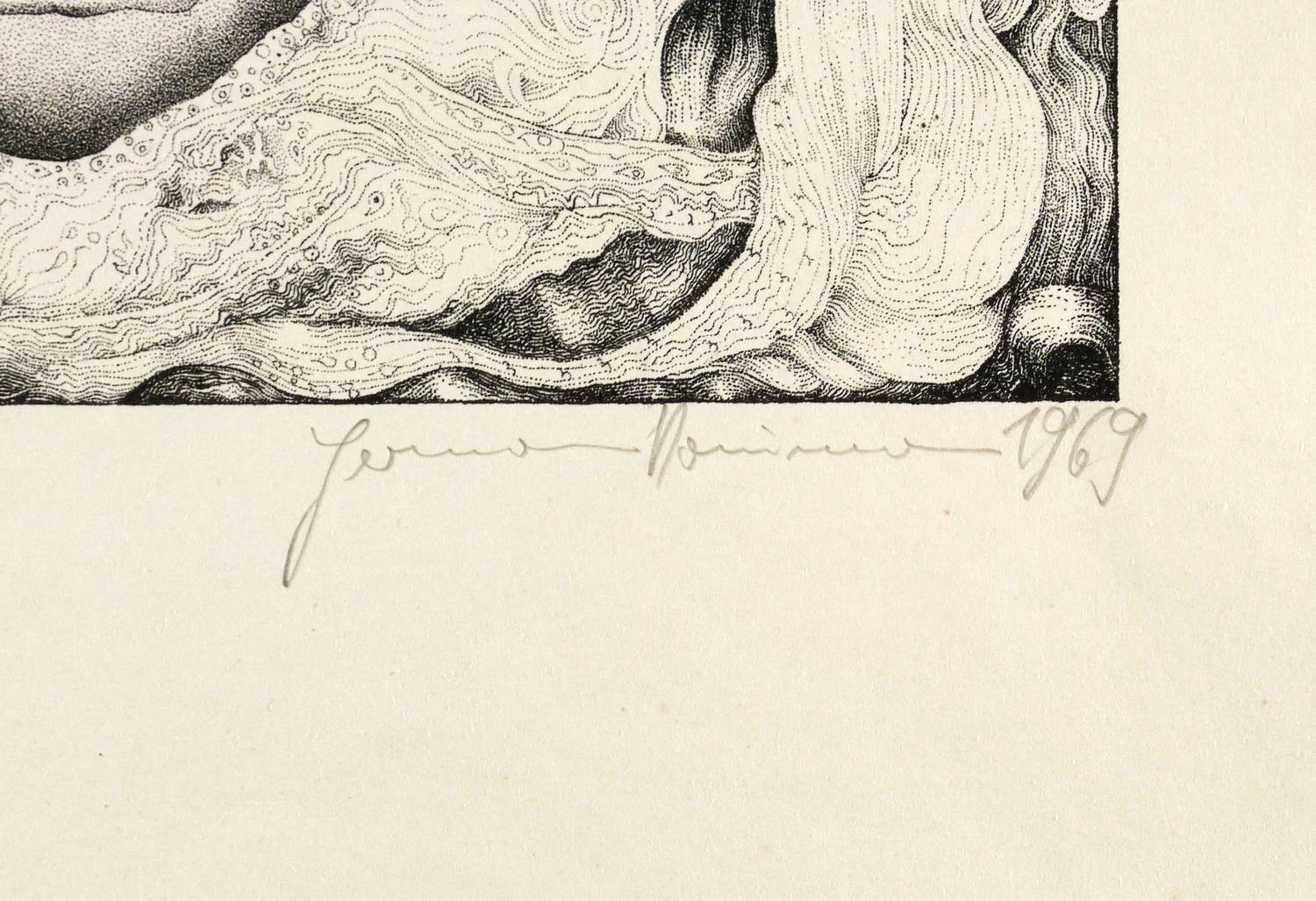 1969. Lithografie / Federlithografie, in Punktiermanier, in Schwarz, auf hartem hellchamois Velin. – Originale Künstlergrafik, von Hermann Naumann. – Probedruck. – 26,8 x 21,1 cm (Darstellung / Druckbild), 50 x 38 cm (Blatt).
