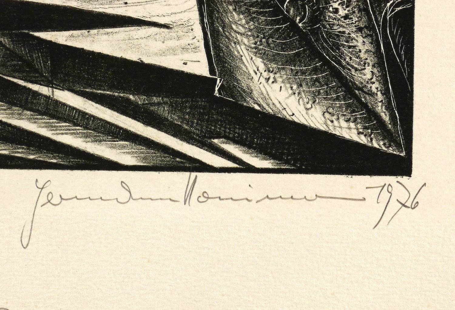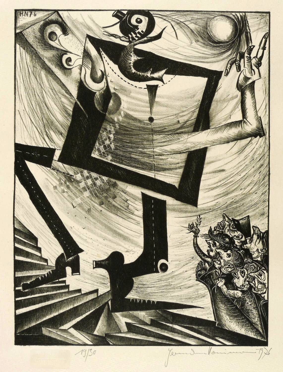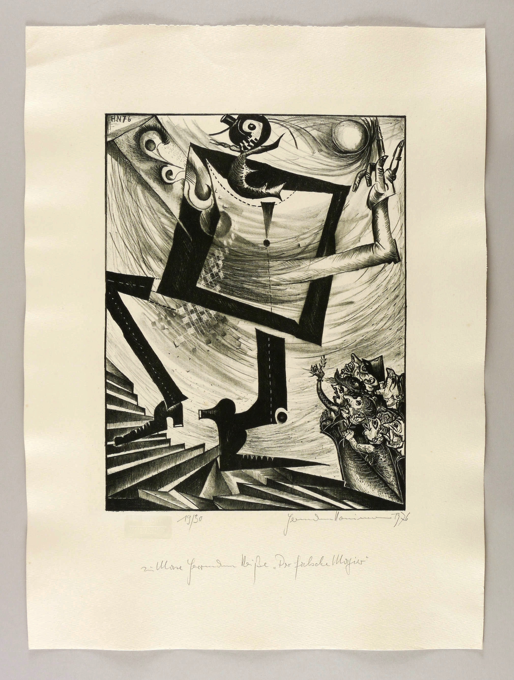 1976. Lithografie / Kreidelithografie, in Schwarz, auf hartem gelblichem Maschinenpapier. – Originale Künstlergrafik, von Hermann Naumann. – Auflage Exemplar Nr. 19/30. – 40,8 x 30,9 cm (Darstellung / Druckbild), 65 x 48 cm (Blatt).
