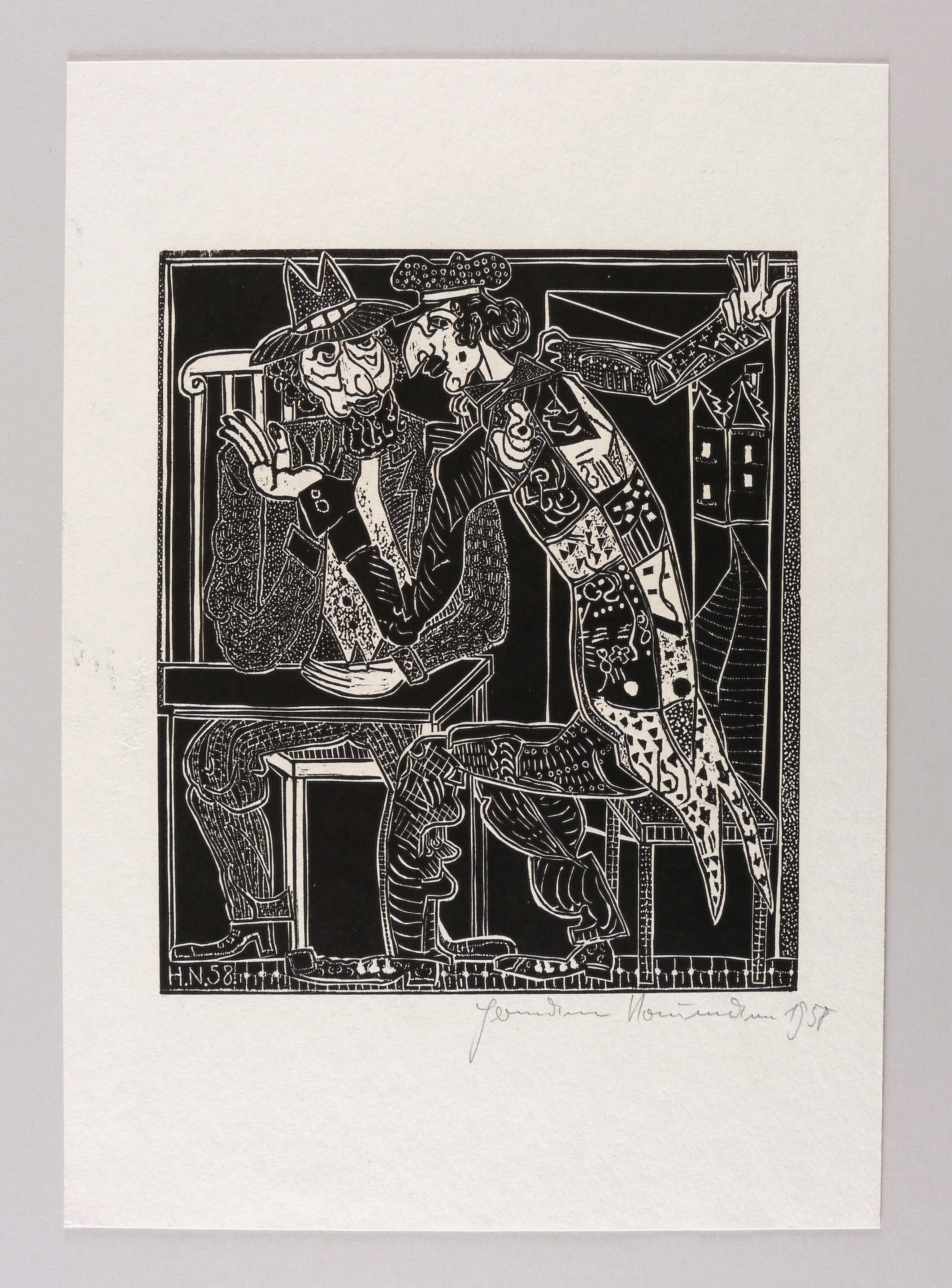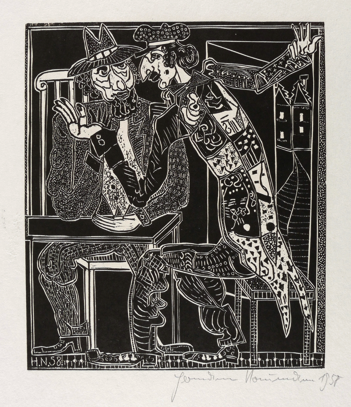 Rechts unten in Bleistift signiert und datiert: ″Hermann Naumann 1958″. Im Druckstock links unten Monogramm und Jahr: ″H.N. 58.″ – Aus der 12-teiligen Holzschnitt-Folge zu ″Tewje der Milchmann″ (Scholem Alejchem). – Sehr guter Zustand.