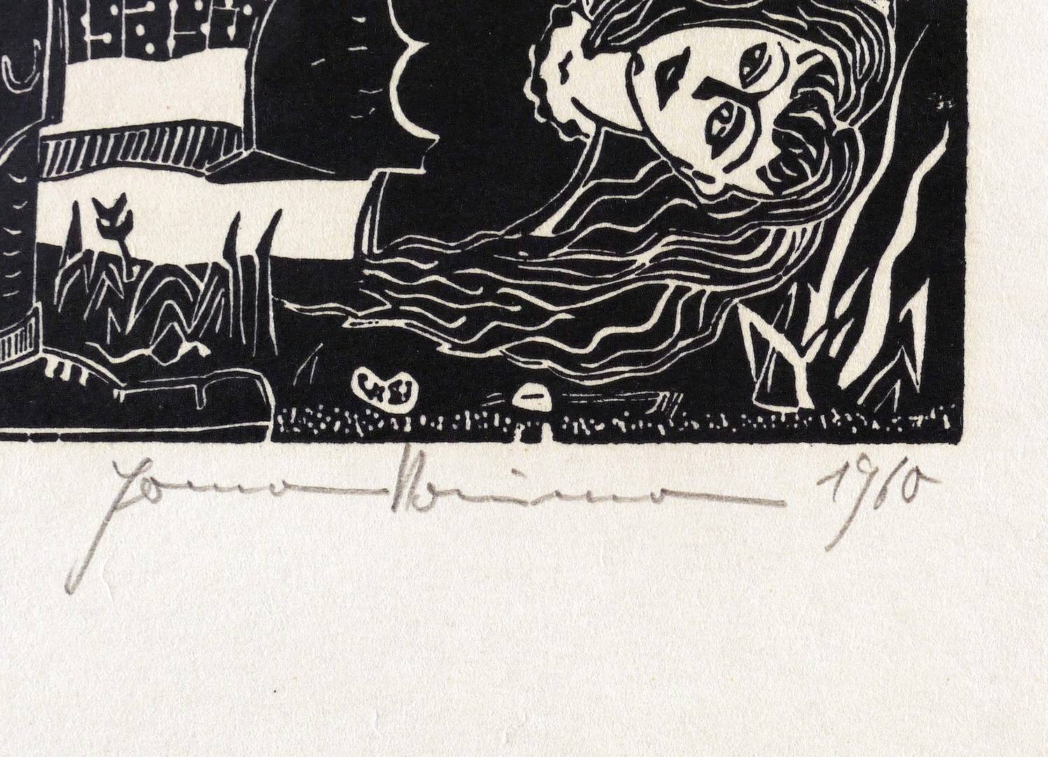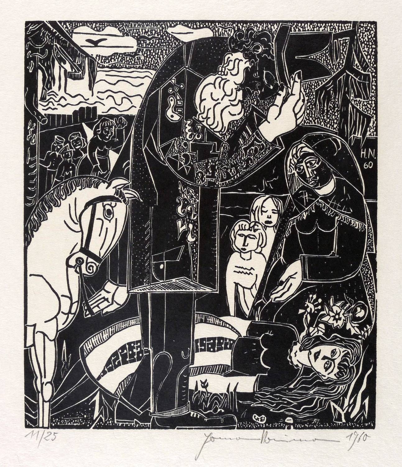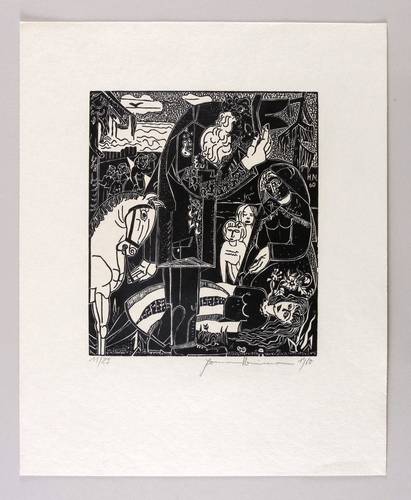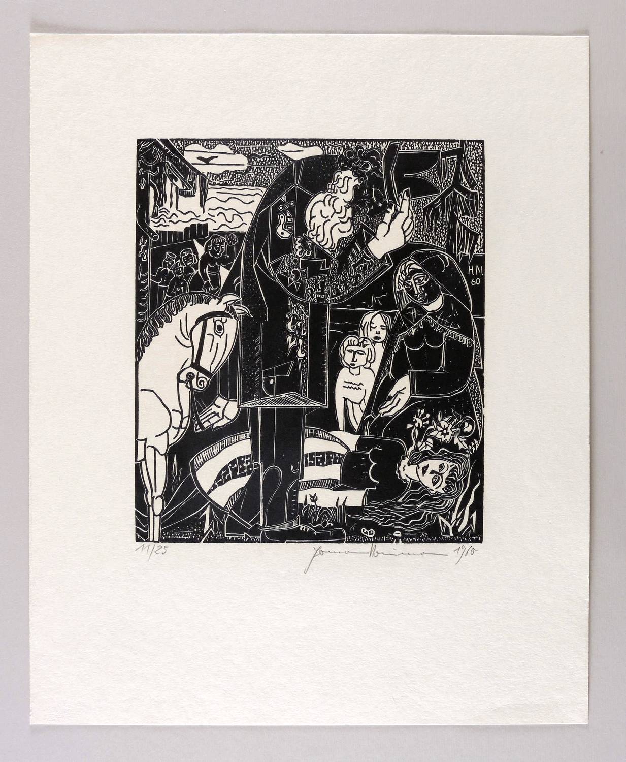 Rechts unten in Bleistift signiert und datiert: ″Hermann Naumann 1960″. Links Auflagenbezeichnung. Im Druckstock am rechten Rand Signatur und Jahr: ″H.N. 60″. – Aus der 12-teiligen Holzschnitt-Folge zu ″Tewje der Milchmann″ (Scholem Alejchem). – Sehr guter Zustand.