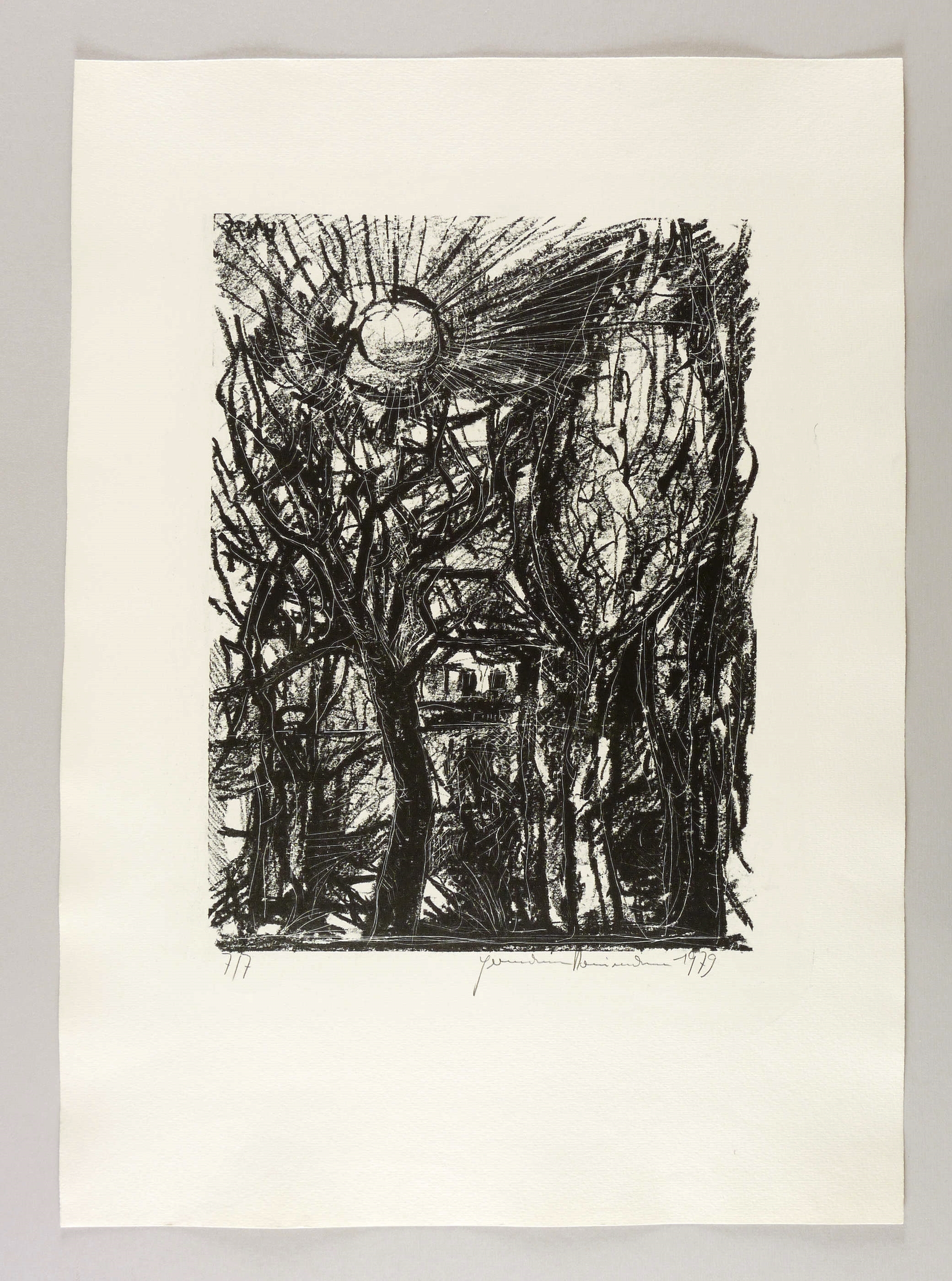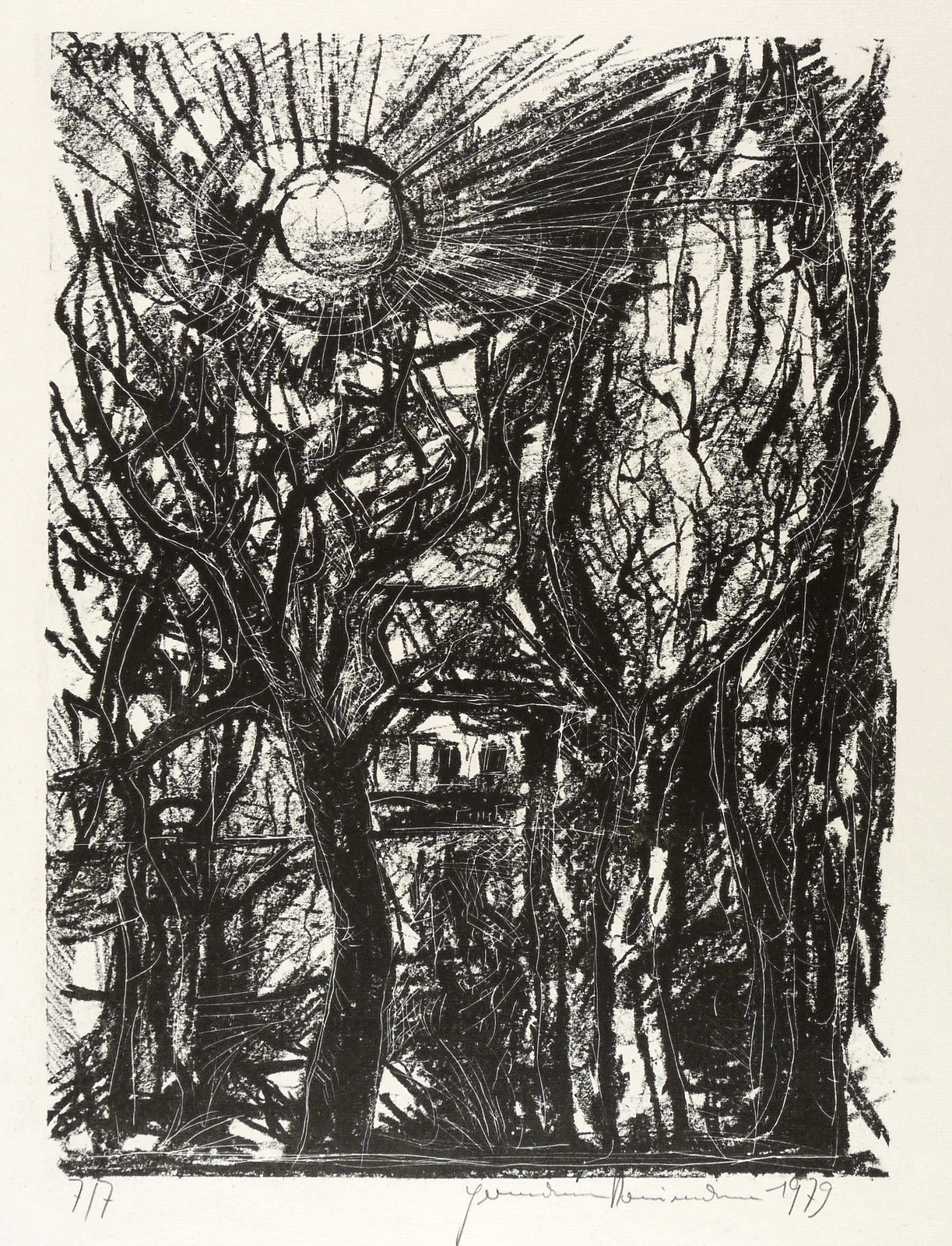 1979. Lithografie / Pinsel- & Kreidelithografie, partiell geschabt, in Schwarz, auf genarbtem chamois Velin. – Originale Künstlergrafik, von Hermann Naumann. – Auflage Exemplar Nr. 7/7. – 40,4 x 30,0 cm (Darstellung / Einfassungslinie), 64 x 47 cm (Blatt).