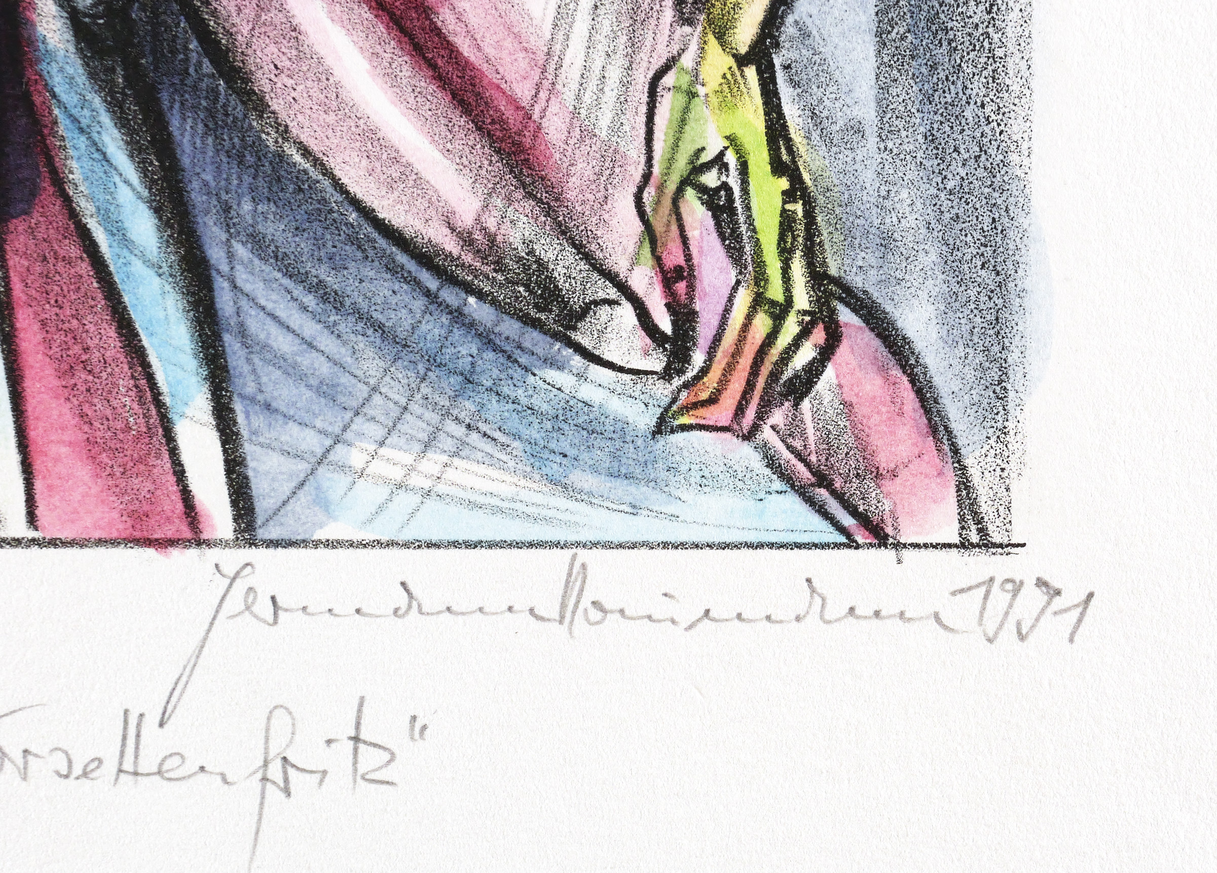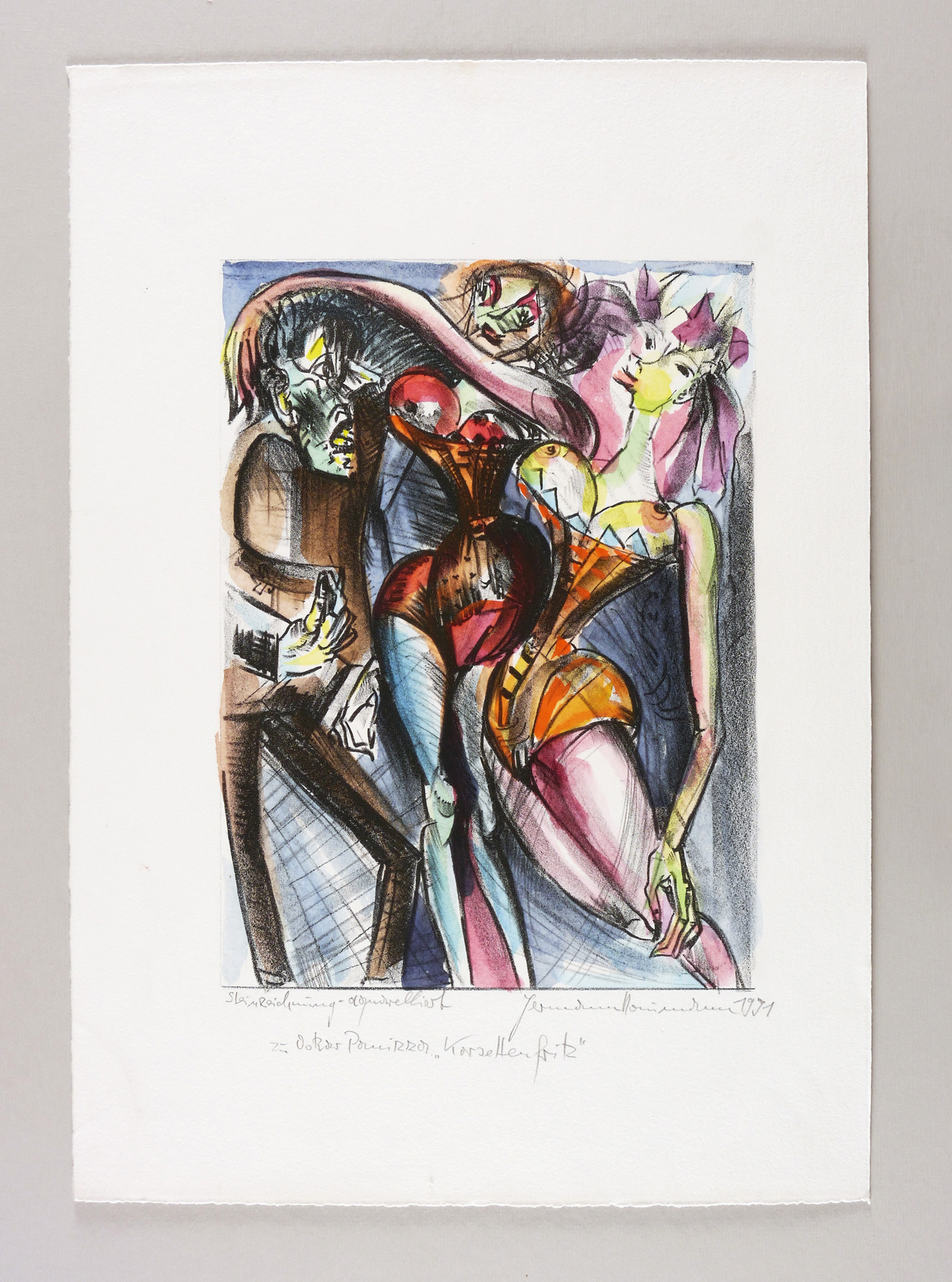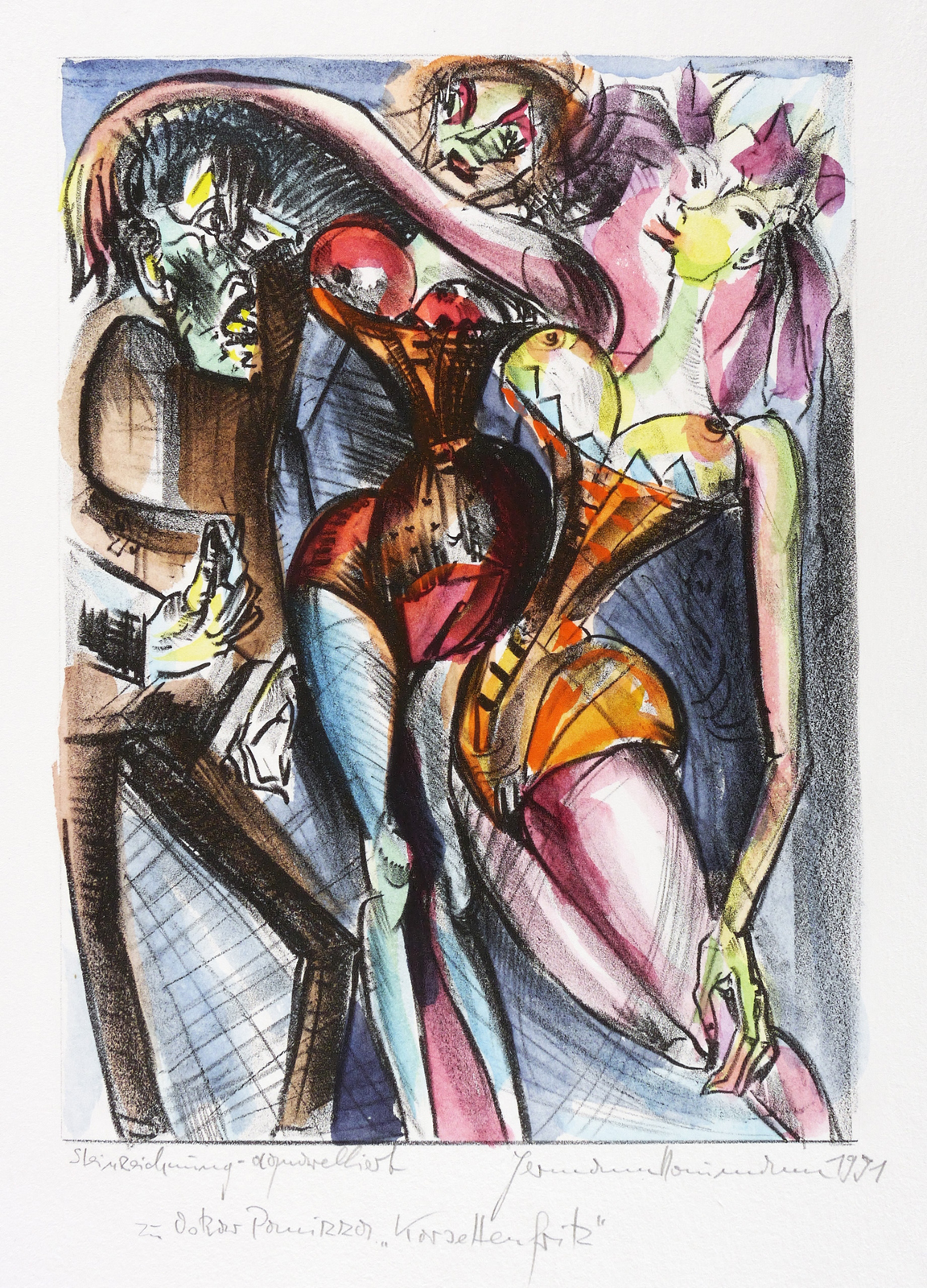 Rechts unten in Bleistift signiert und datiert: ″Hermann Naumann 1991″. Links Technikbezeichnung: ″Steinzeichnung aquarelliert″. Darunter mittig betitelt: ″zu Oskar Panizza 'Korsettenfritz'″. – Tadelloses Exemplar. Sehr guter Zustand.