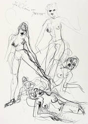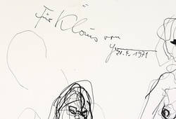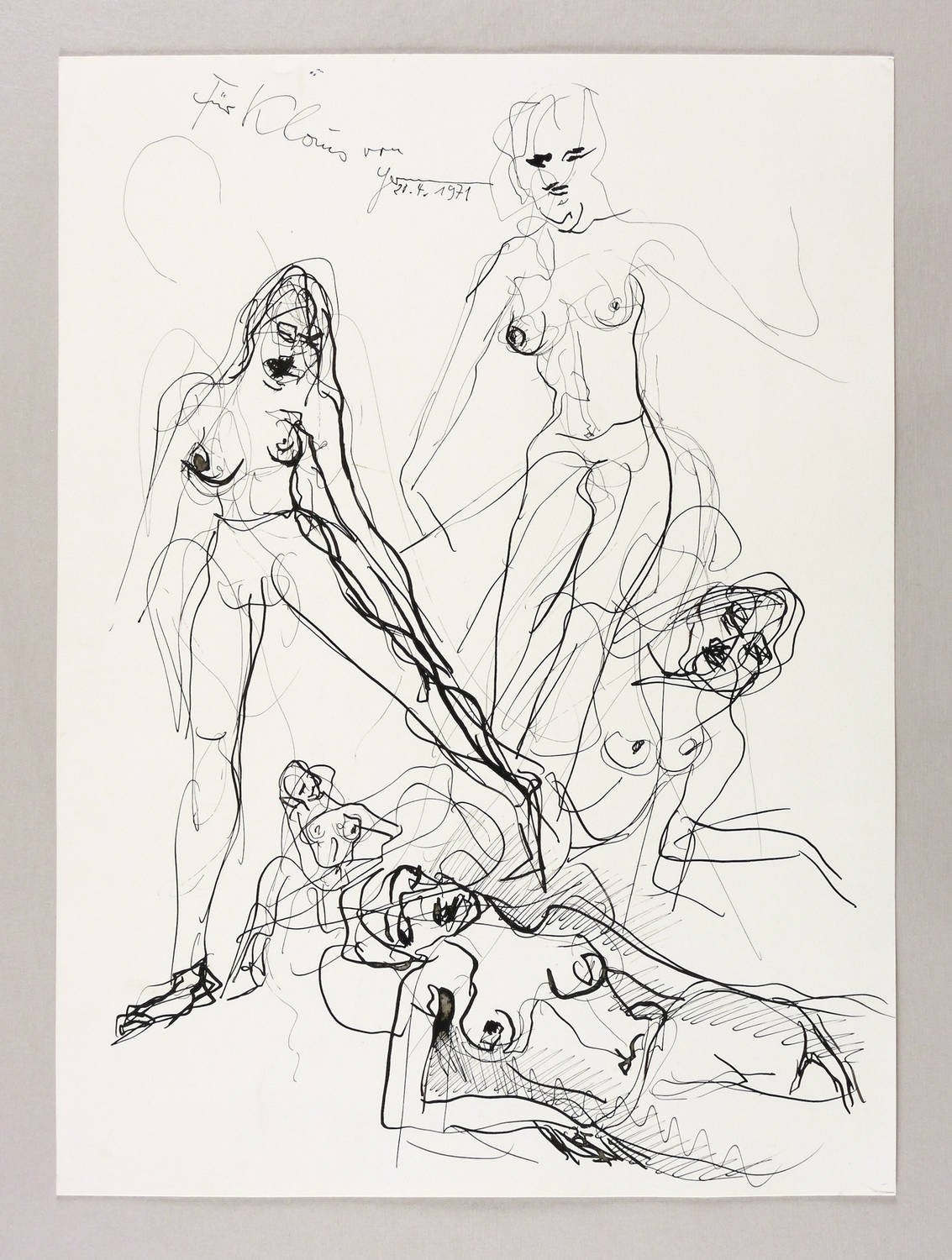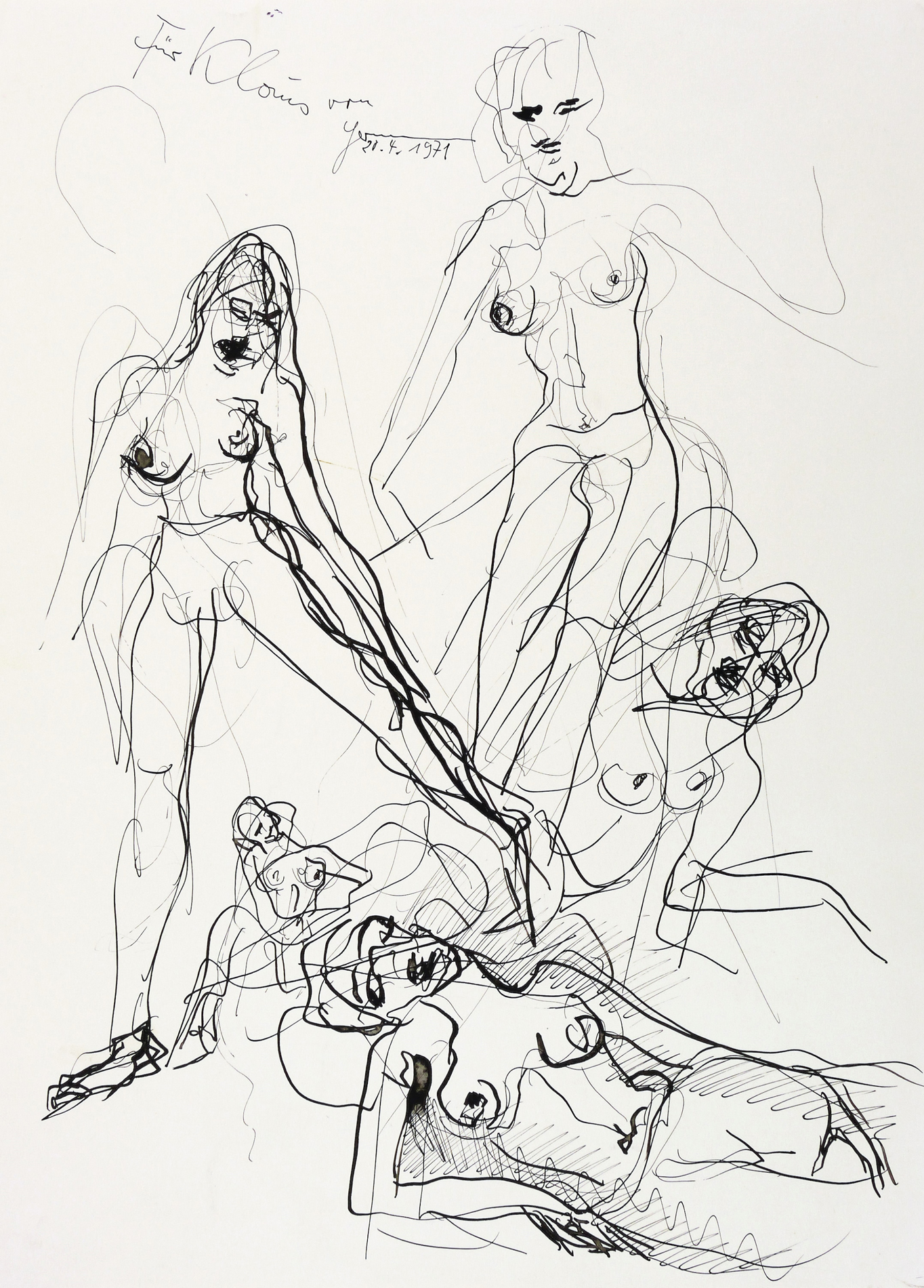 Links oben in schwarzer Tusche Widmung mit Signatur und Jahr: ″Für Klaus von Hermann 20.4.1971″. – Verso zahlreiche weitere sehr freihändige Akt- Skizzen in schwarzer Feder. – Tadellos. Sehr guter Zustand.