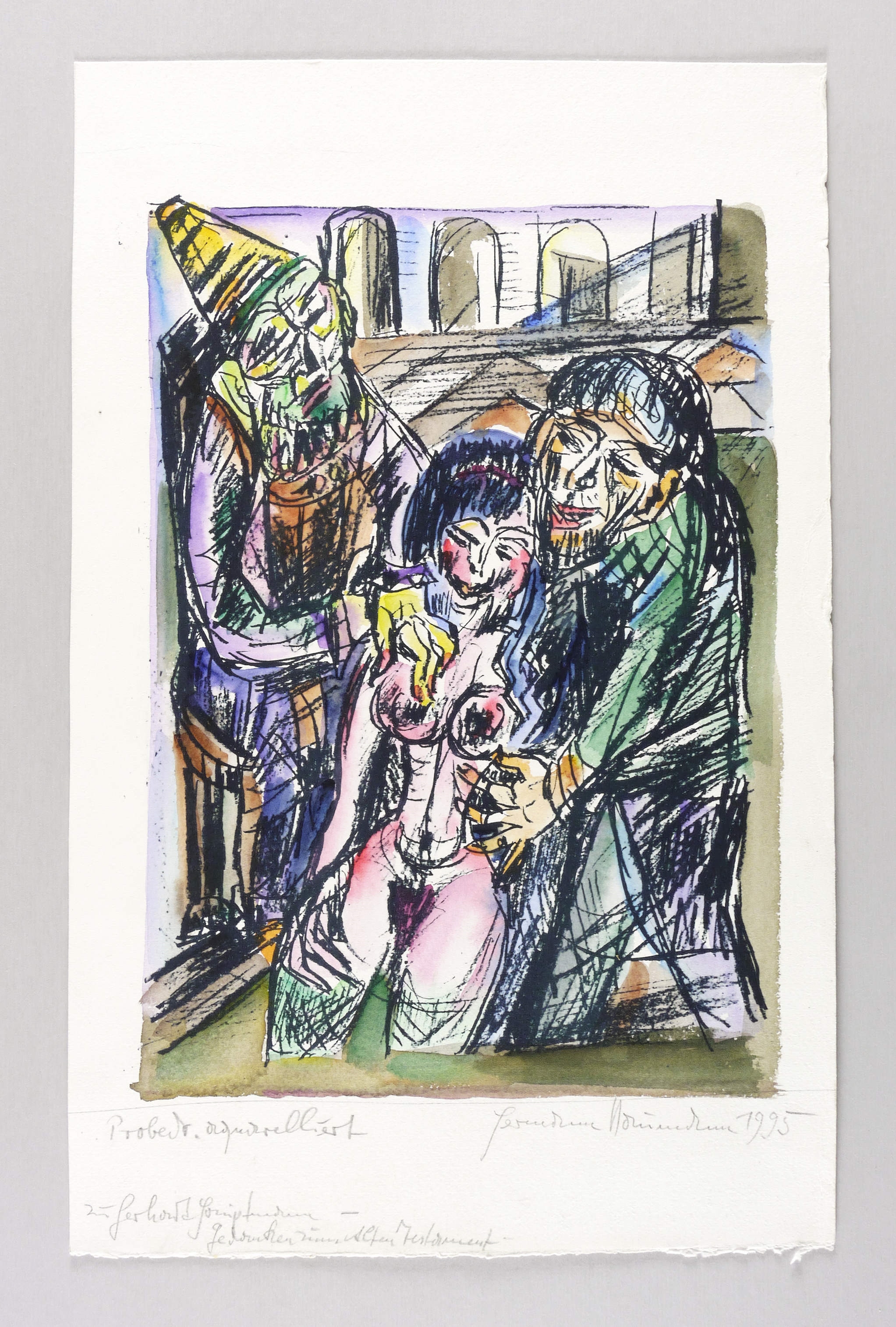 Rechts unten in Bleistift signiert und datiert: ″Hermann Naumann 1995″. Links Auflagen- und Technikbezeichnung: ″Probedruck aquarelliert″. Darunter bezeichnet: ″zu Gerhart Hauptmann - Gedanken zum Alten Testament″. – Illustrierende Darstellung zu Gerhart Hauptmann's ″Gedanken zum Alten Testament″. – Tadelloses Exemplar. Sehr guter Zustand.