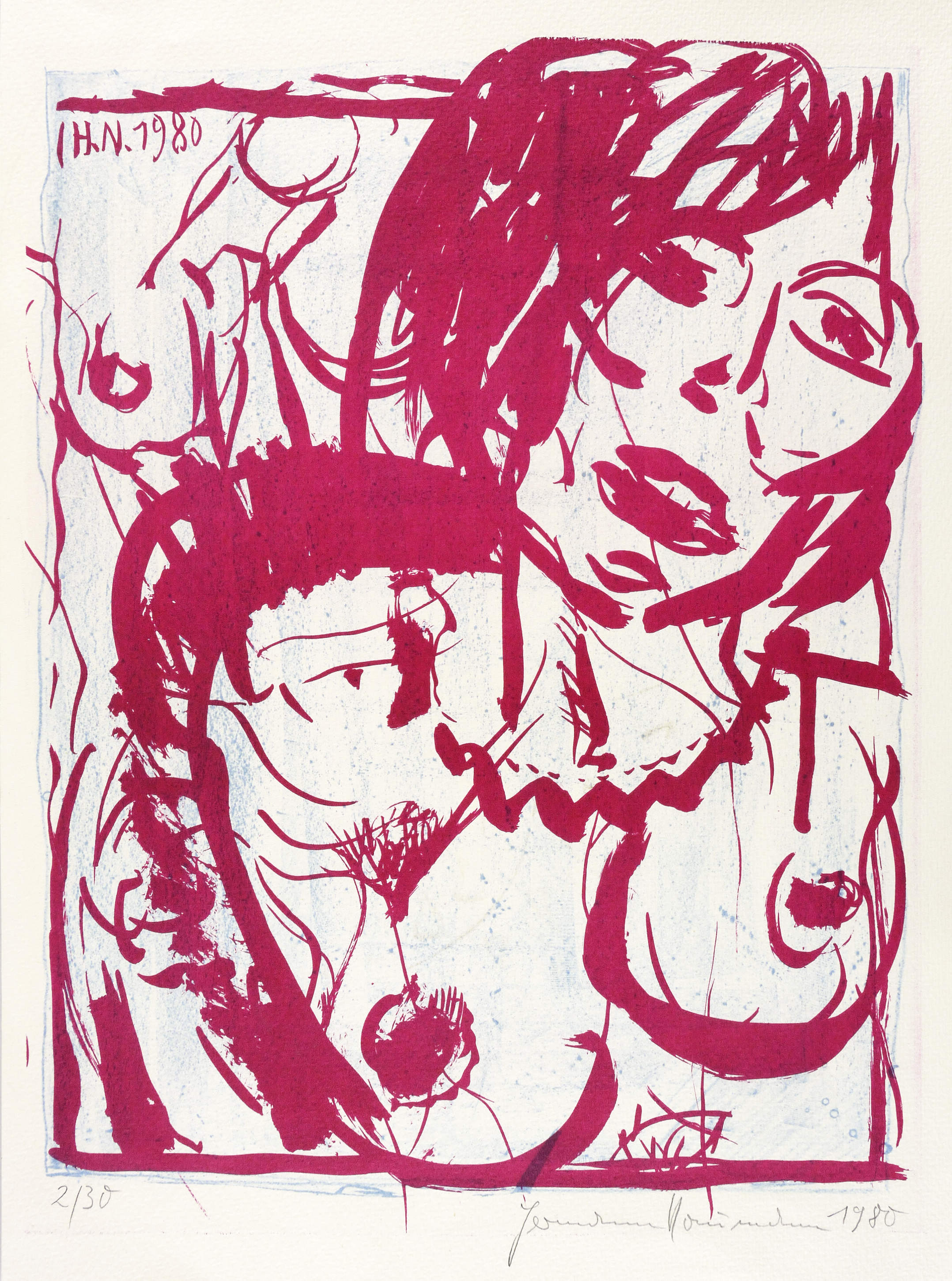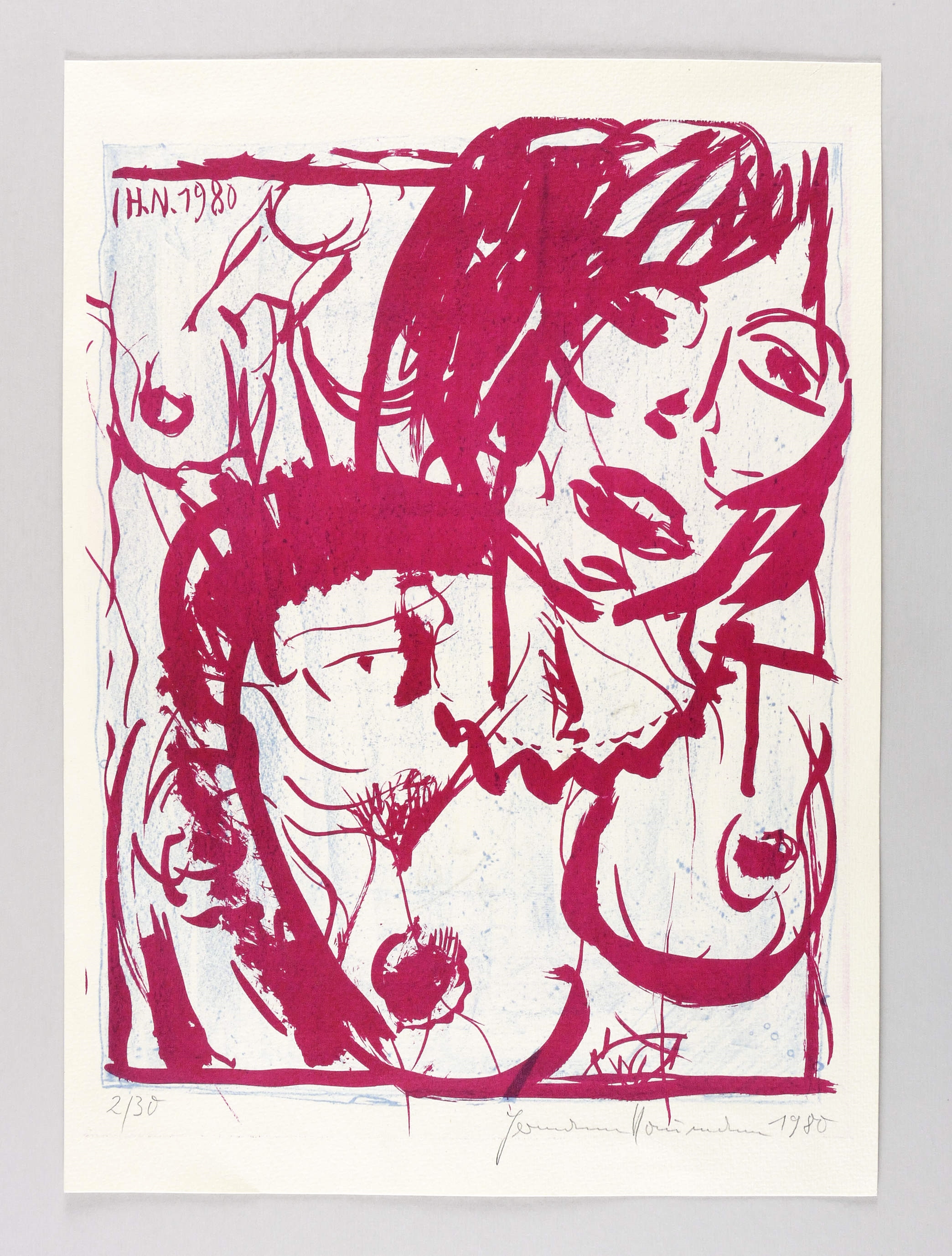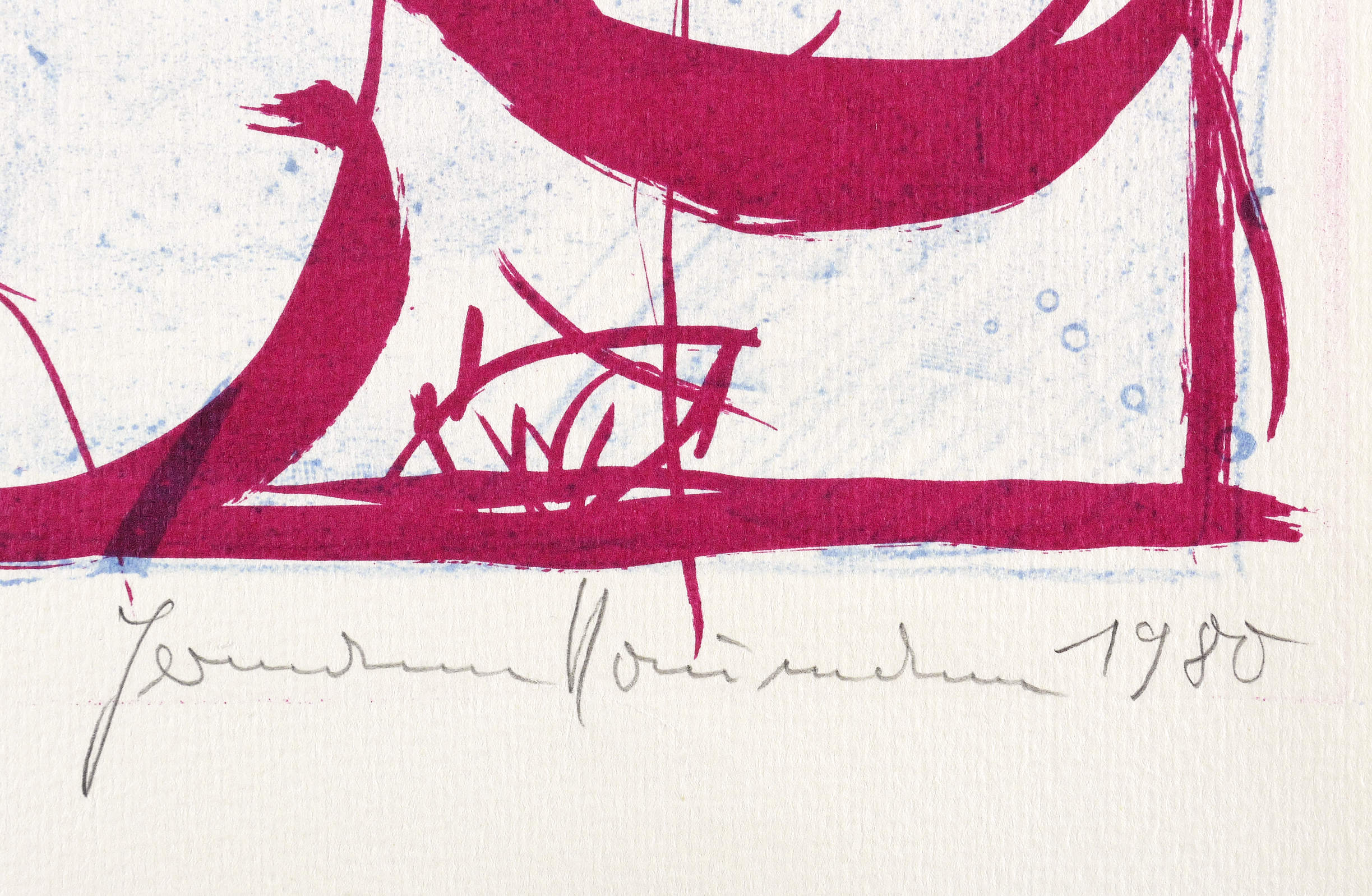 1980. Farblithografie / Pinsellithografie, in Hellblau & Rot, auf hartem gehämmertem Maschinenpapier. – Originale Künstlergrafik, von Hermann Naumann. – Auflage Exemplar Nr. 2/30. – 44,1 x 33,1 cm (Darstellung / Druckbild), 49 x 36 cm (Blatt).