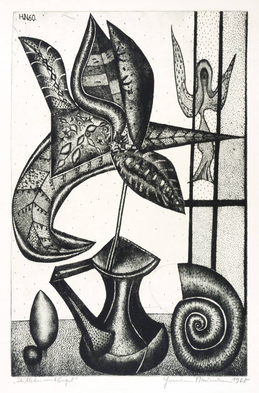 Rechts unten in Bleistift signiert: ″Hermann Naumann 1960″. Links Titel: ″Stilleben mit Engel″. In der Platte links oben Signatur und Jahr: ″H.N. 60″. – Originalrandiges Exemplar. Sehr guter Zustand.