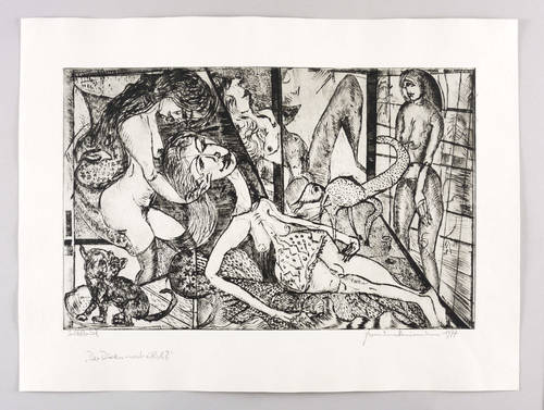 Rechts unten in Bleistift signiert und datiert: ″Hermann Naumann 1977″. Links bezeichnet: ″Selbstdruck″. Im unteren Blattrand Titel: ″Der Divan - west-östlich?″. – Sehr guter Zustand.