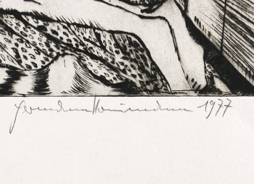 1977. Radierung / Kaltnadel & Punzenstich, in Schwarz, auf kräftigem gelblichem Velin. – Originale Künstlergrafik, von Hermann Naumann. – 32,5 x 51,3 cm (Darstellung / Platte), 47 x 62 cm (Blatt).