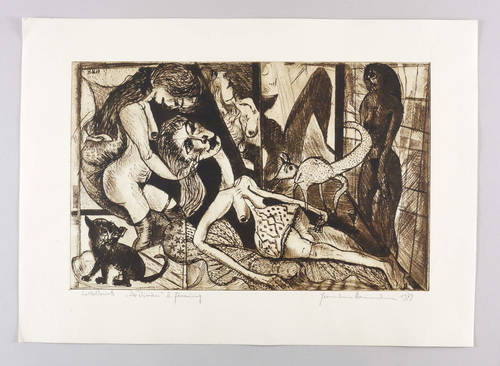 Rechts unten in Bleistift signiert und datiert: ″Hermann Naumann 1979″. Links bezeichnet: ″Selbstdruck″. Daneben Titel: ″Der Divan II. Fassung″. In der Platte links oben Signatur und Jahr: ″H.N. 79″. – Leichte Alters- und Lagerspuren. Guter Zustand.