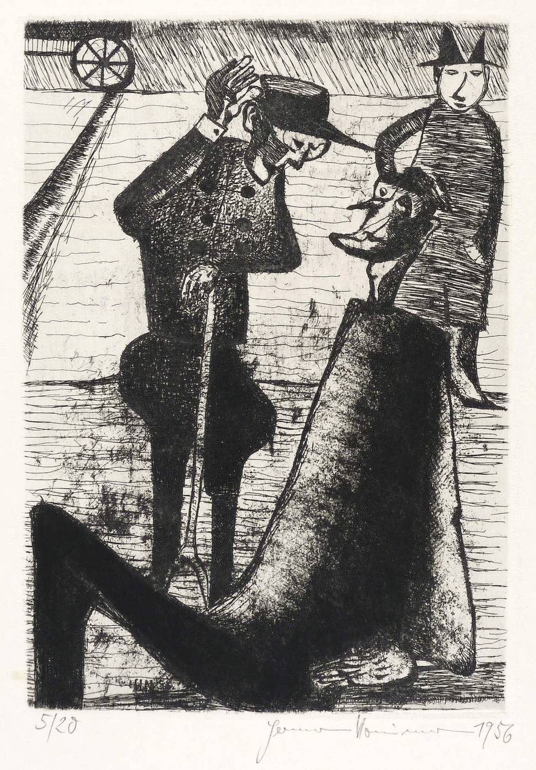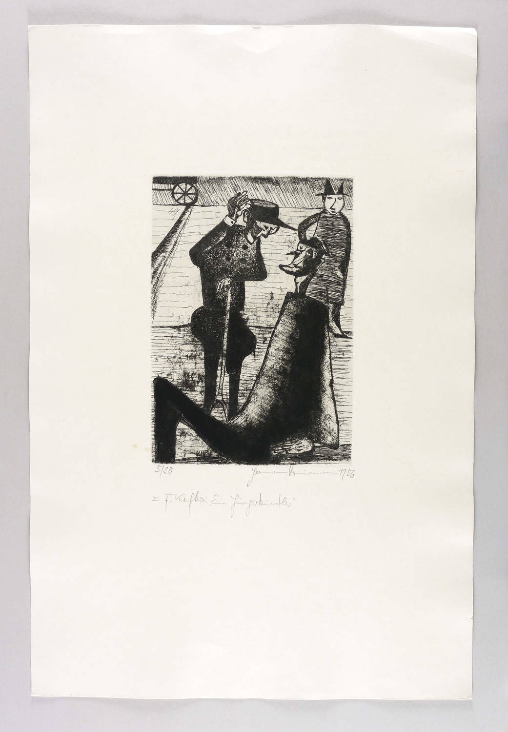 Rechts unten in Bleistift signiert und datiert: ″Hermann Naumann 1956″. Links Auflagenbezeichnung: ″5/20″. Darunter Titel: ″zu F. Kafka: 'Ein Hungerkünstler'″. – Unbeschnittenes originalrandiges Exemplar. Am linken unteren Plattenrand zwei kleine schwach ausgeprägte Fleckchen. Sonst ohne Mängel. Mäßig guter Zustand.