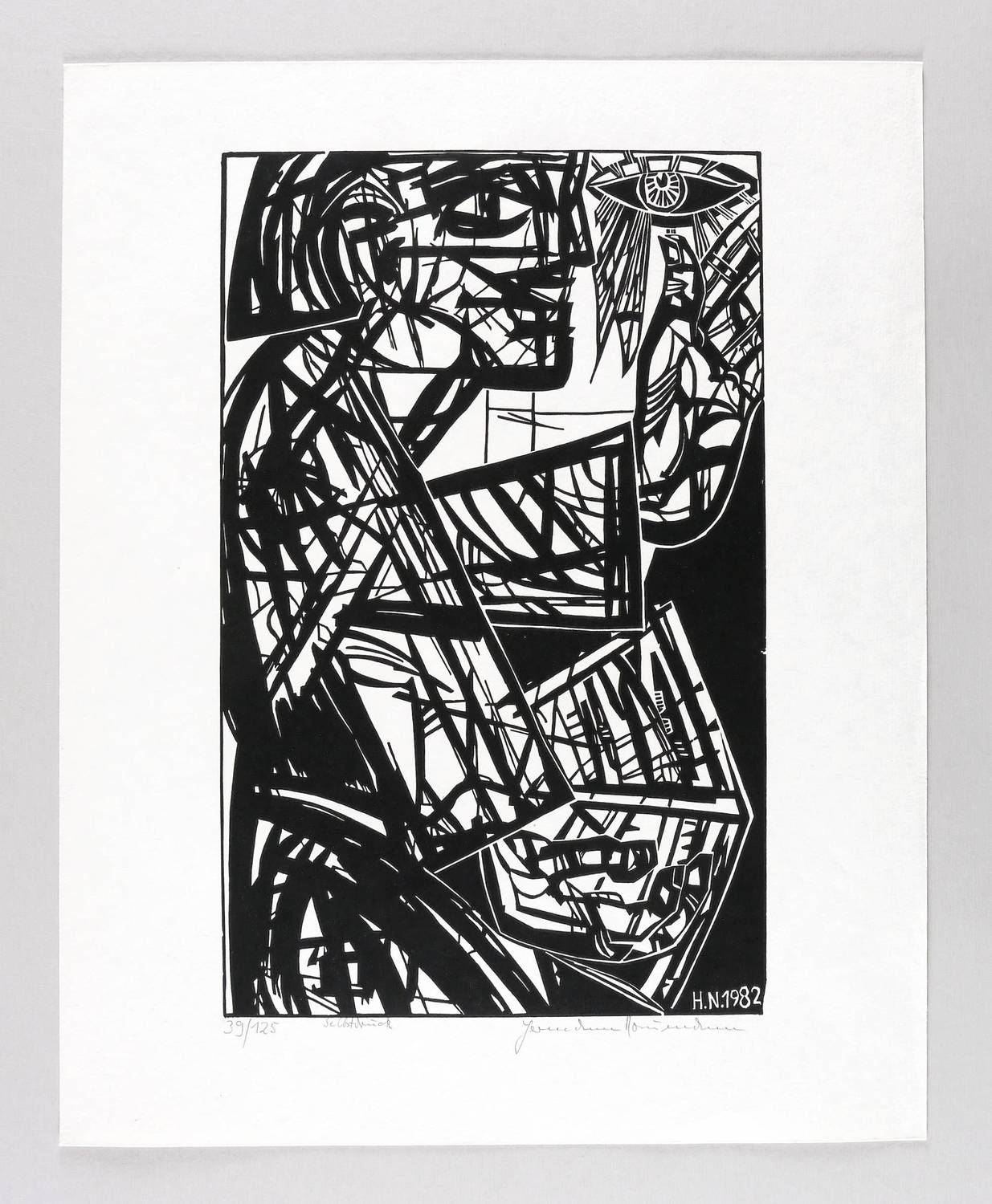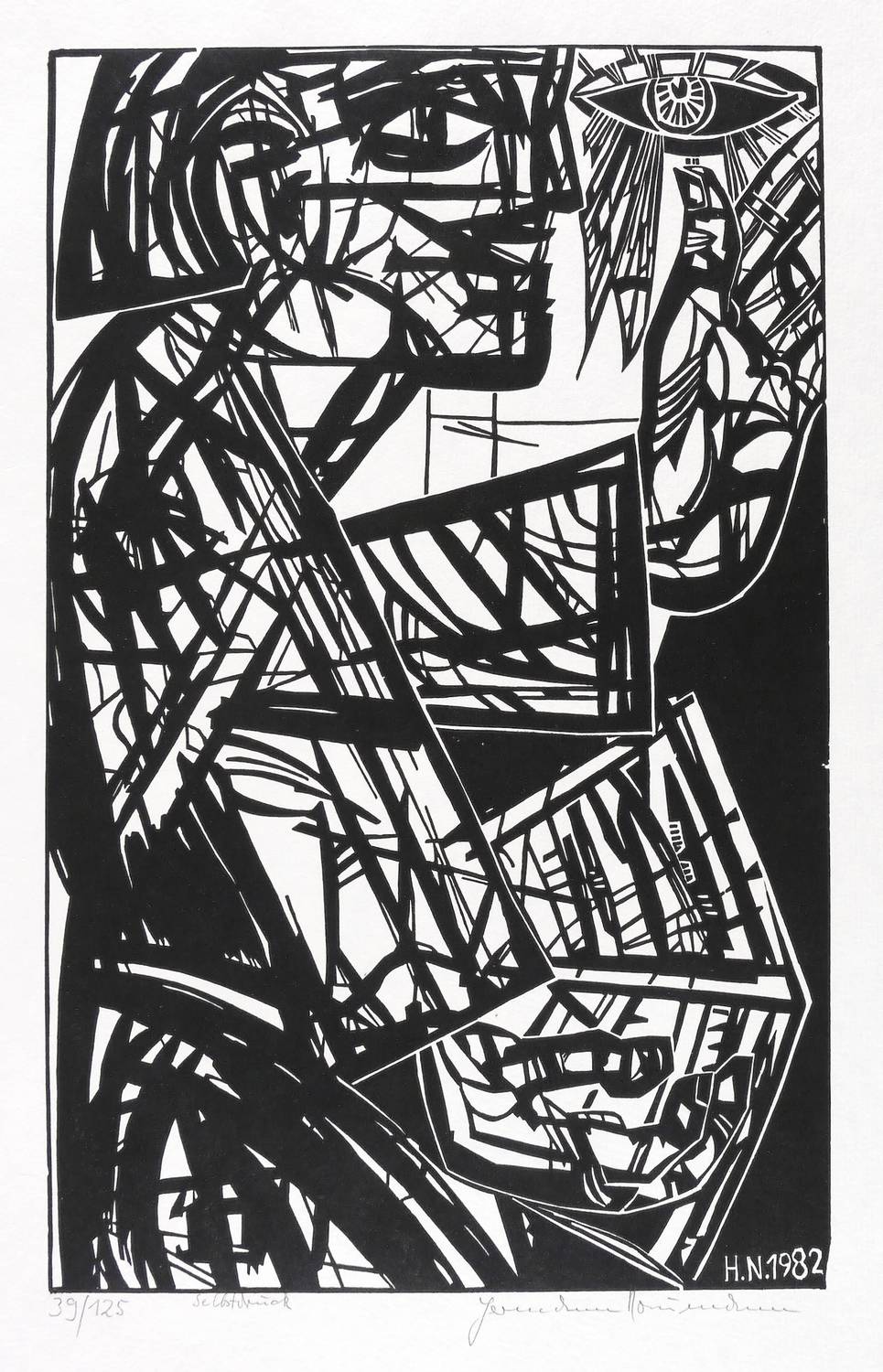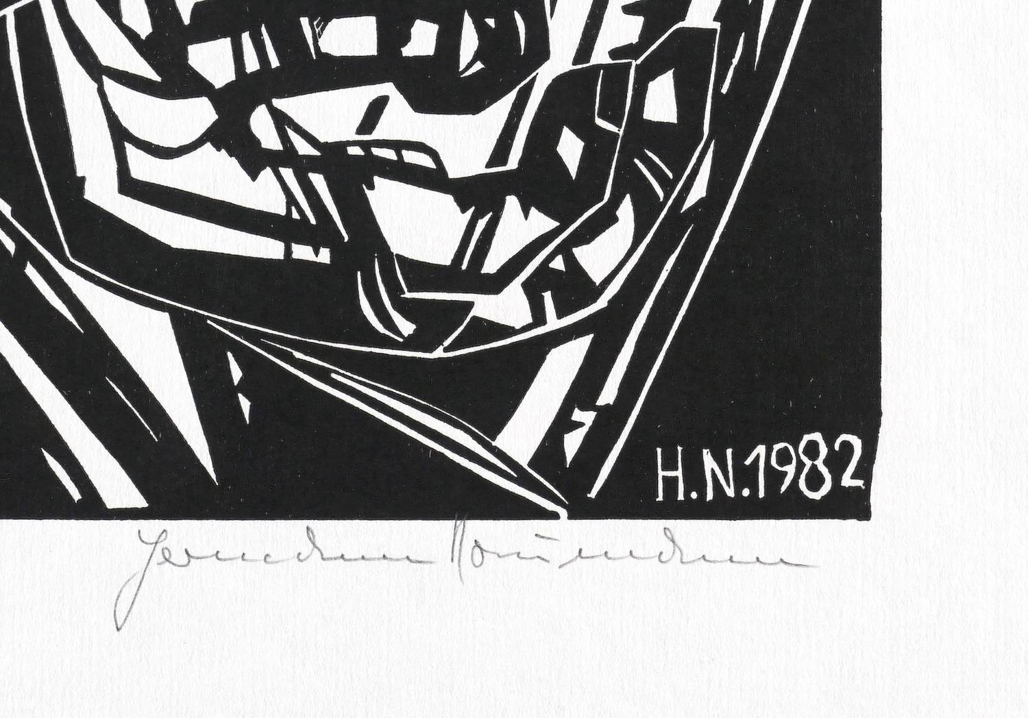 1982. Holzschnitt, in Schwarz, auf wolkig-rauem hellem Velin. – Originale Künstlergrafik, von Hermann Naumann. – Auflage Exemplar Nr. 39/125. – 40,0 x 25,0 cm (Darstellung / Druckstock), 50 x 40 cm (Blatt).