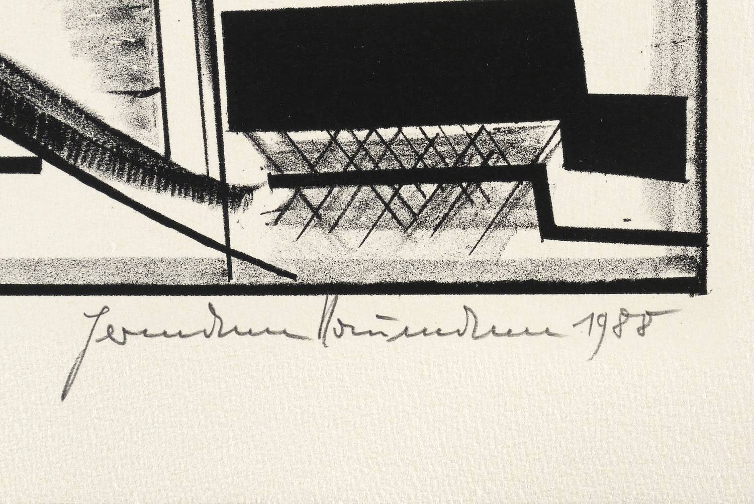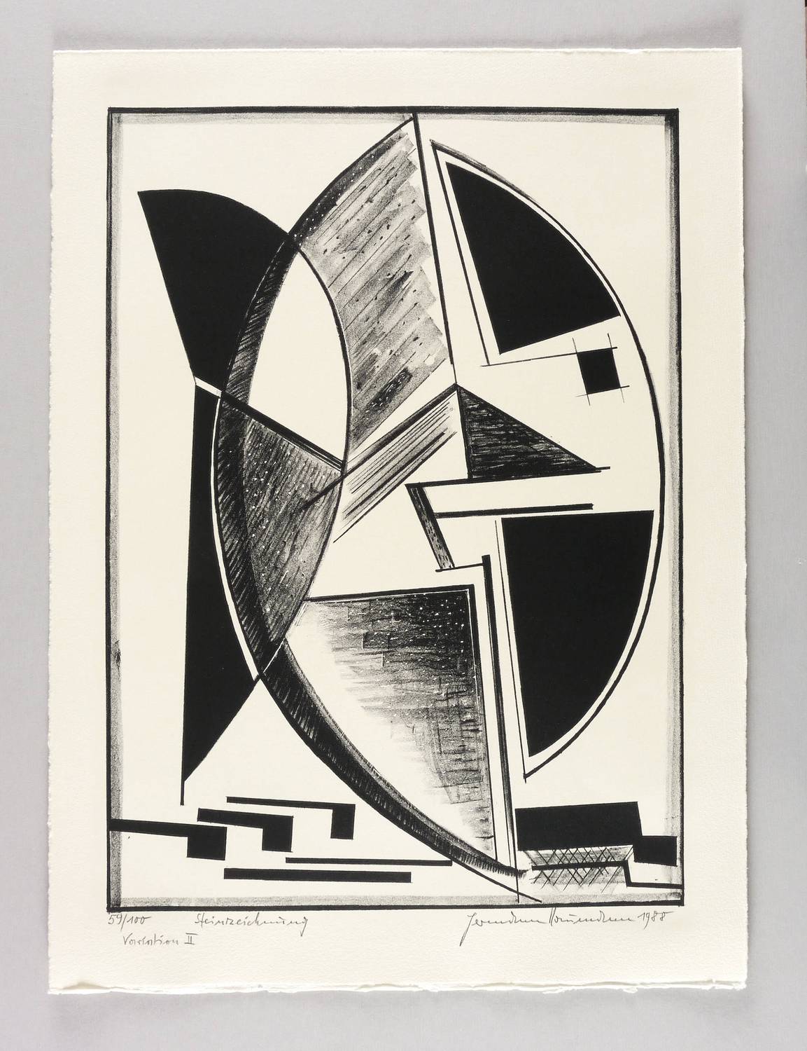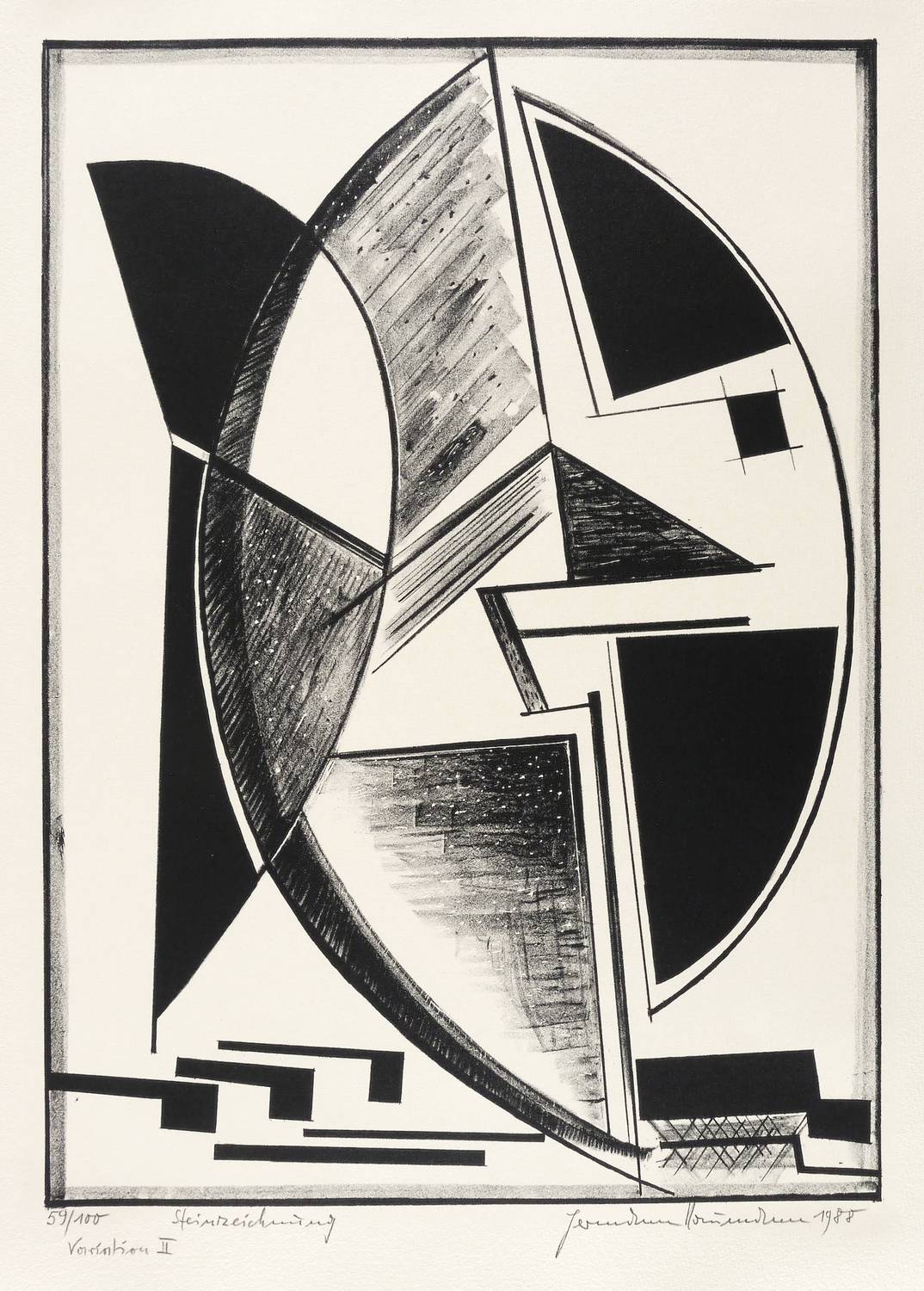 Aus: Hermann Naumann, Ich atme mächtige Züge des Raumes ein. Grafik-Edition XXXI (Leipzig: Reclam 1990). – Rechts unten in Bleistift signiert und datiert: ″Hermann Naumann 1988″. Links Auflagen- und Technikbezeichnung: ″59/100 // Steindruck″. Dazu Titel: ″Variation II″. – Tadellos erhalten. Sehr guter Zustand.