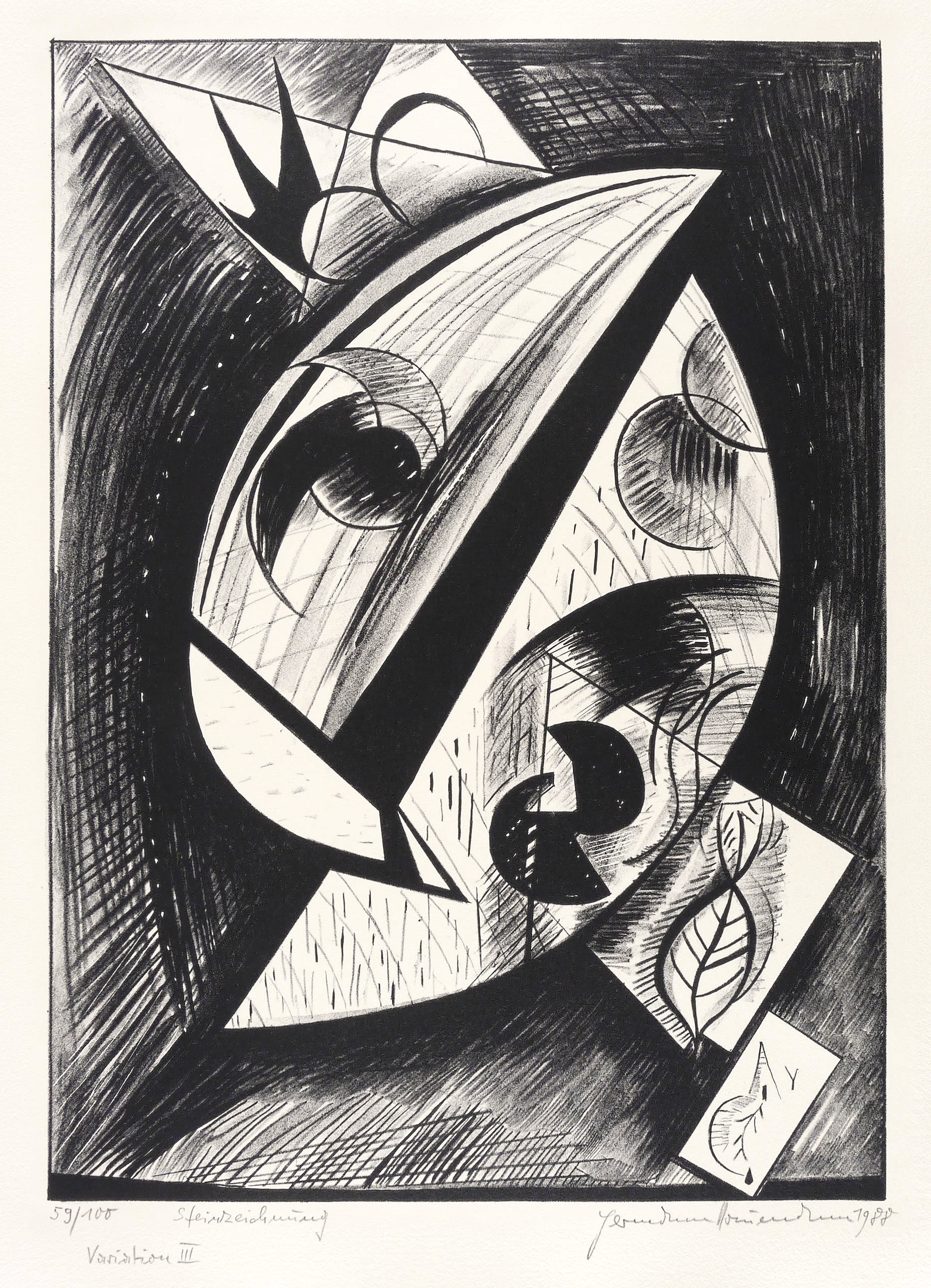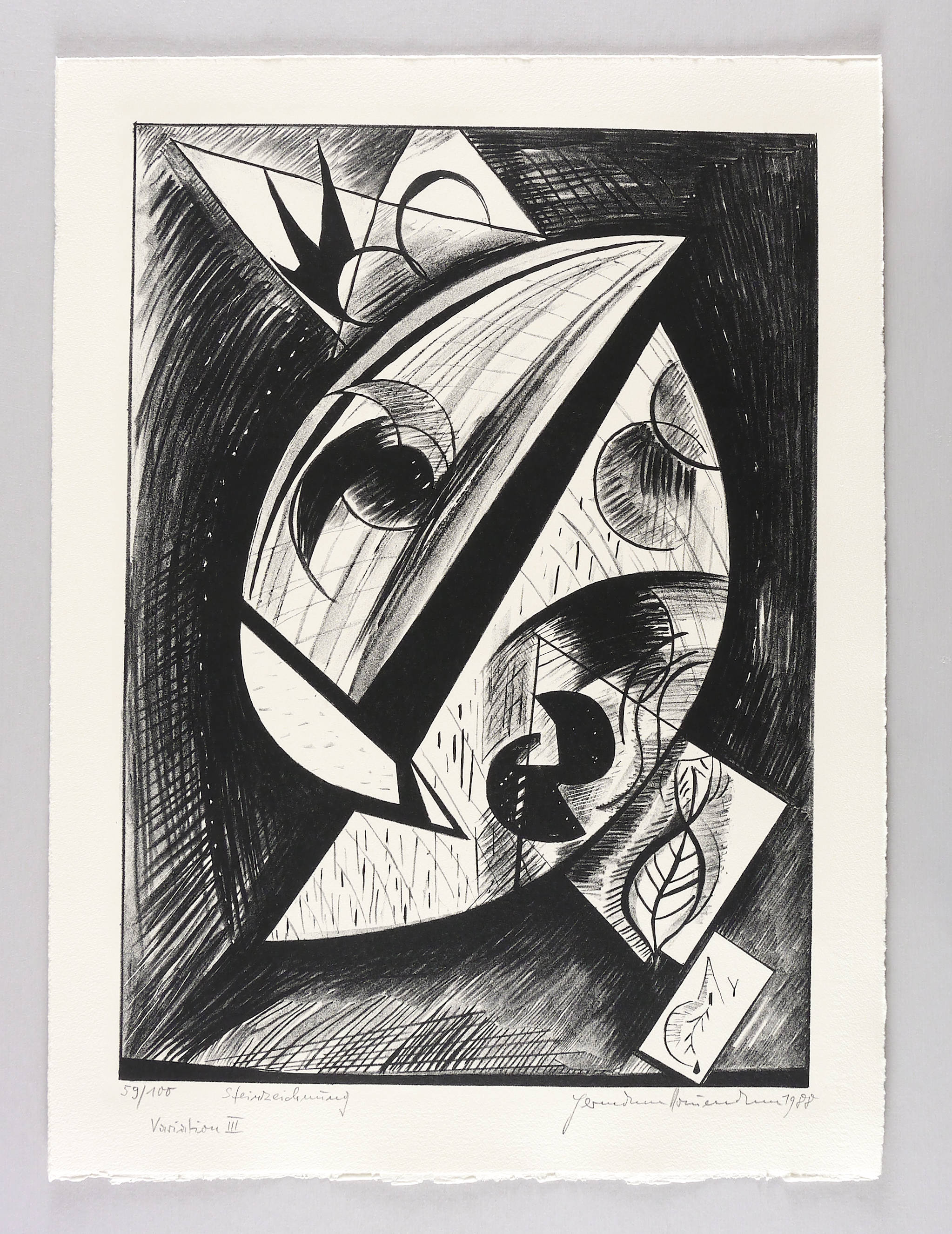 Aus: Hermann Naumann, Ich atme mächtige Züge des Raumes ein. Grafik-Edition XXXI (Leipzig: Reclam 1990). – Rechts unten in Bleistift signiert und datiert: ″Hermann Naumann 1988″. Links Auflagen- und Technikbezeichnung: ″59/100 // Steindruck″. Dazu Titel: ″Variation III″. Wasserzeichen der Hahnemühle. – Tadellos erhalten. Sehr guter Zustand.