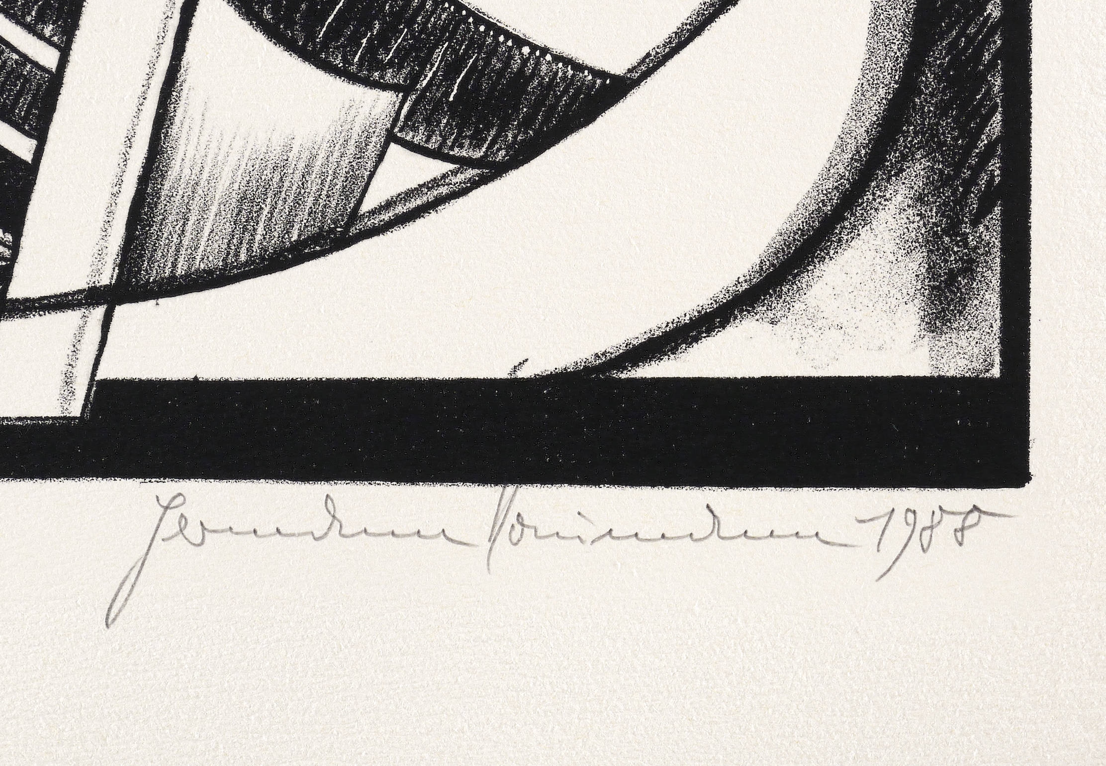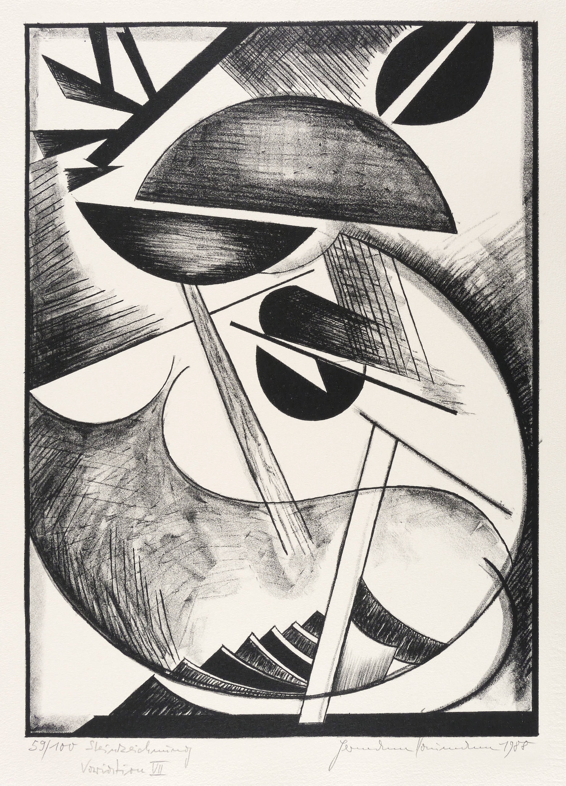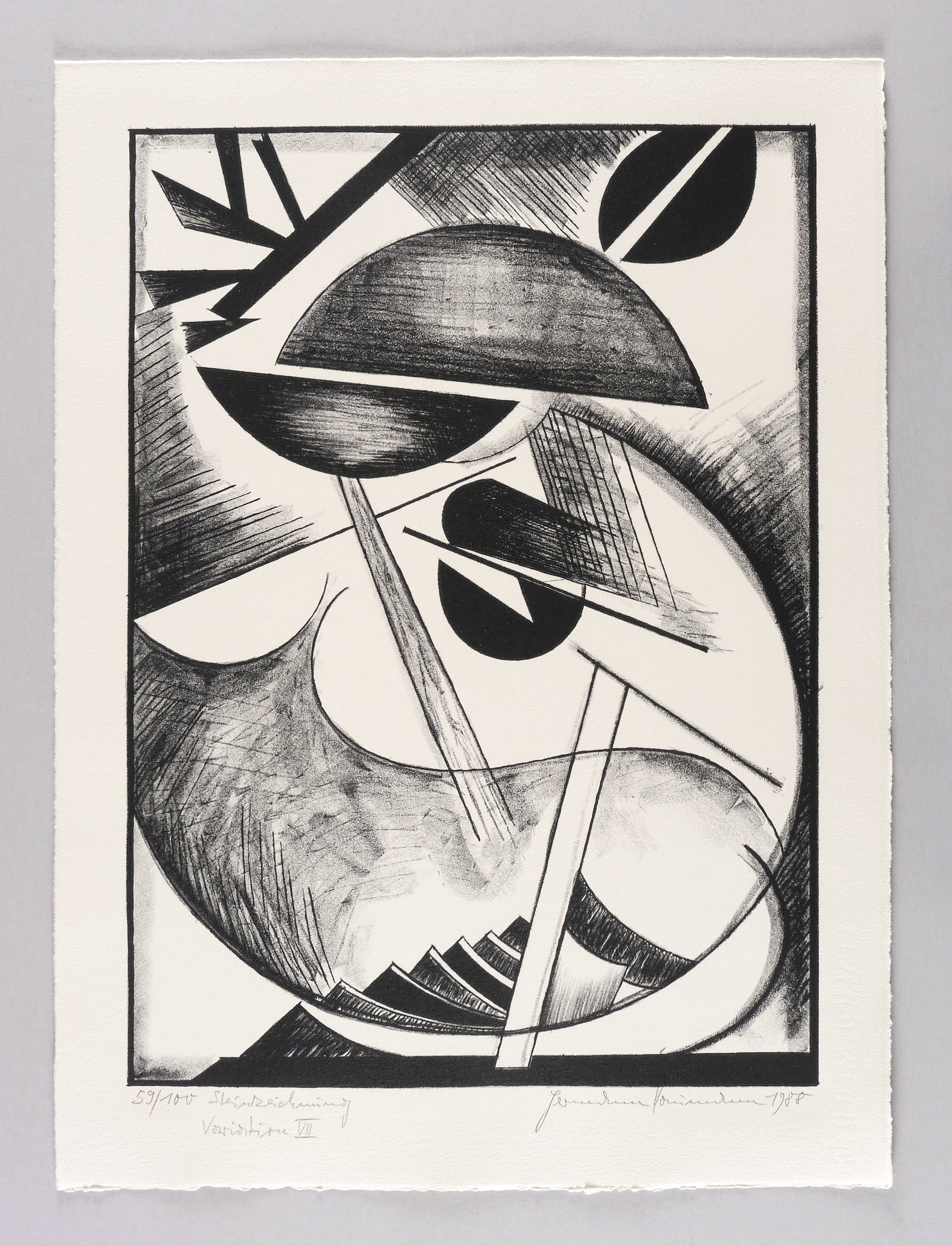 Aus: Hermann Naumann, Ich atme mächtige Züge des Raumes ein. Grafik-Edition XXXI (Leipzig: Reclam 1990). – Rechts unten in Bleistift signiert und datiert: ″Hermann Naumann 1988″. Links Auflagen- und Technikbezeichnung: ″59/100 // Steindruck″. Dazu Titel: ″Variation VII″. Wasserzeichen der Hahnemühle. – Tadellos erhalten. Sehr guter Zustand.