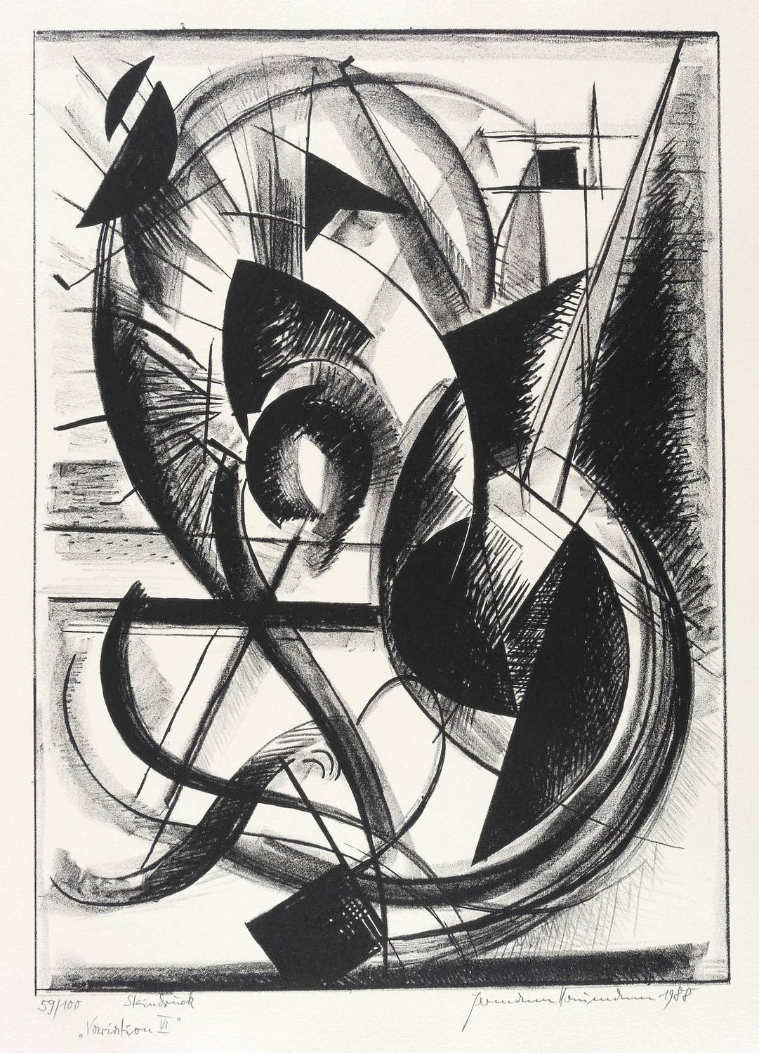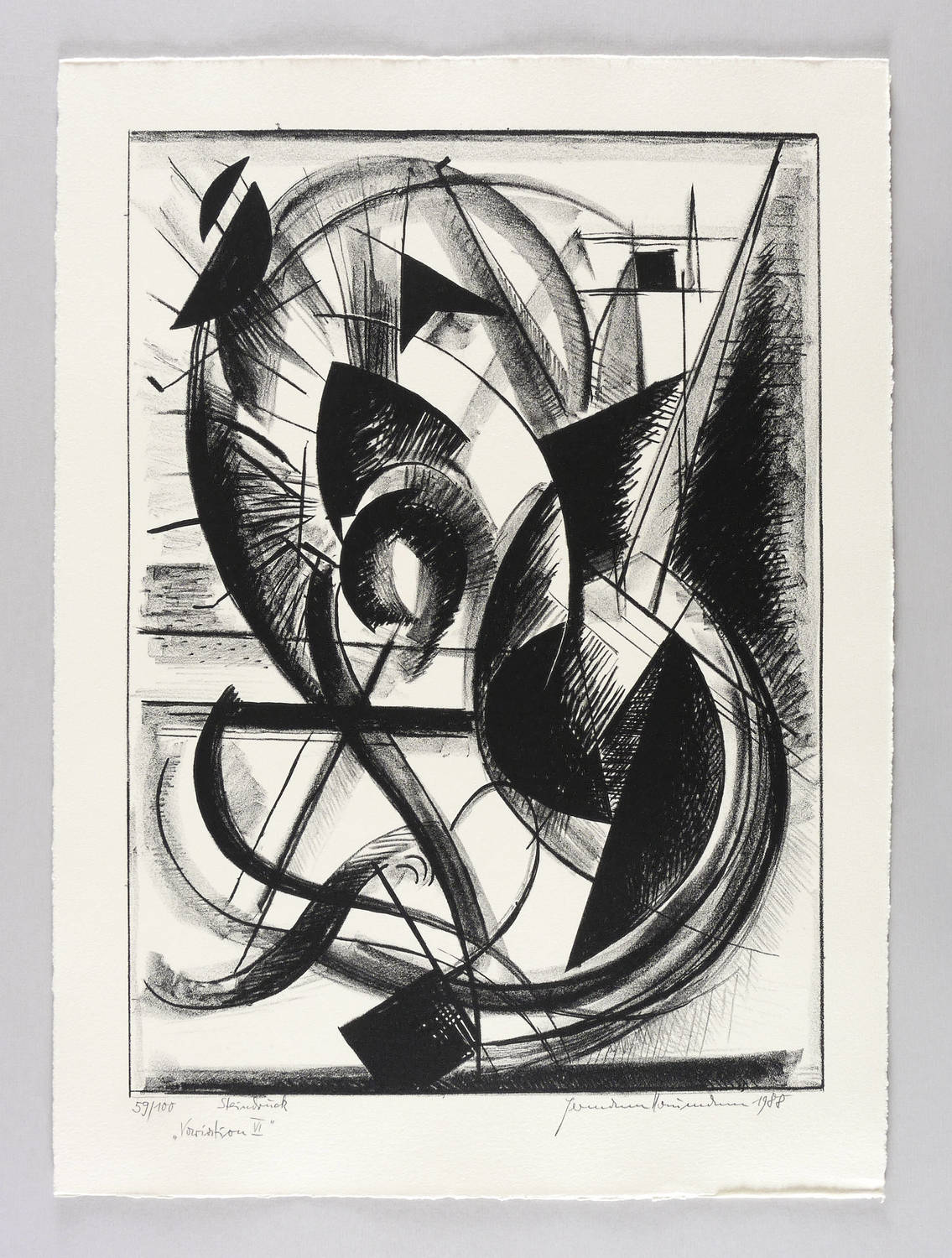 Aus: Hermann Naumann, Ich atme mächtige Züge des Raumes ein. Grafik-Edition XXXI (Leipzig: Reclam 1990). – Rechts unten in Bleistift signiert und datiert: ″Hermann Naumann 1988″. Links Auflagen- und Technikbezeichnung: ″59/100 // Steindruck″. Dazu Titel: ″Variation VI″. – Tadellos erhalten. Sehr guter Zustand.
