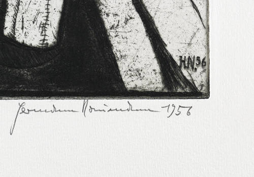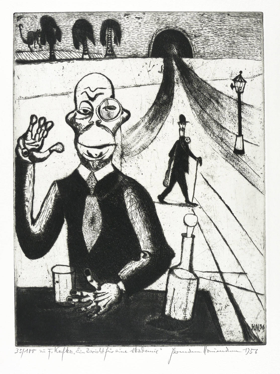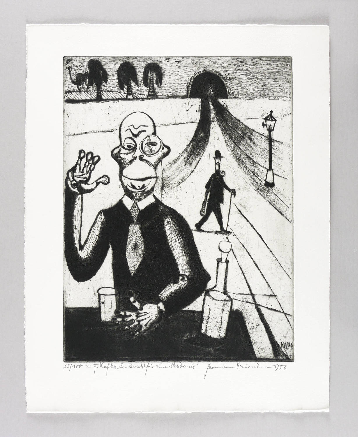 Aus: Hermann Naumann, Grafik zu Franz Kafka. Grafik-Edition XXI (Leipzig: Reclam 1985). – Rechts unten in Bleistift signiert und datiert: ″Hermann Naumann 1956″. Links Auflagenbezeichnung und Titel: ″35/100 // zu F. Kafka 'Ein Bericht für eine Akademie'″. In der Platte rechts unten Signatur und Jahr: ″H.N. 56″. Wasserzeichen der Hahnemühle. – Schöner Abzug. Ohne Mängel. Sehr guter Zustand.