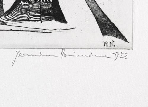 Aus: Hermann Naumann, Grafik zu Franz Kafka. Grafik-Edition XXI (Leipzig: Reclam 1985). – Rechts unten in Bleistift signiert und datiert: ″Hermann Naumann 1952″. Links Auflagenbezeichnung: ″35/100″. In der Platte rechts unten Signatur: ″H.N.″ Wasserzeichen der Hahnemühle. – Sehr guter Zustand.