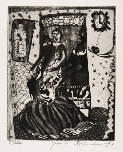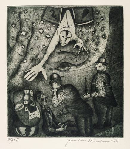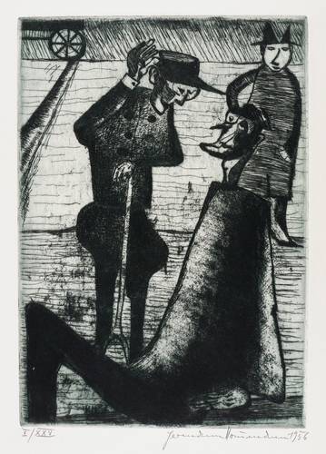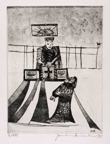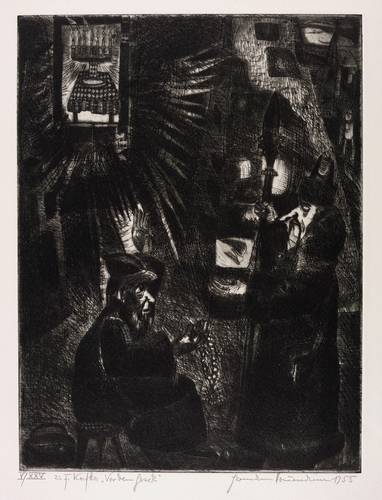 Hermann Naumann (1930 Kötzschenbroda-Radebeul - 2025 Dittersbach-Dürrröhrsdorf). Deutscher Maler, Grafiker und Bildhauer. 1946 Lehre als Steinmetz und Privatausbildung zum Plastiker bei Burkhart Ebe. 1947-49 Bildhauerlehre bei Herbert Volwahsen. 1950 Aufnahme in den Verband Bildender Künstler Deutschlands (VBKD) und Bezug des Ateliers im Künstlerhaus Dresden-Loschwitz. Seitdem freischaffend tätig. Gleichzeitig Beginn der Beschäftigung mit Malerei und Druckgrafik; erste Ölgemälde und Illustrationen zu Dostojewski. 1952 die berühmte Punzenstich-Folge zu Franz Kafka "Der Prozeß". 1969 Auszeichnung "Schönste Bücher der DDR" für die Illustrationen zu "Meine jüdischen Augen" beim Verlag Philipp Reclam jun. Leipzig. Ausstellungen: 1977 Kunsthalle Rostock, 1988 Stadtmuseum Bautzen, 2010, '13 und '22 Galerie Himmel Dresden.