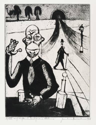 Aus: Hermann Naumann, Grafik zu Franz Kafka. Grafik-Edition XXI (Leipzig: Reclam 1985). – Jedes Blatt in Bleistift signiert und datiert. Links Auflagenbezeichnung. – Vollständiges Mappenwerk mit allen 8 Punzenstichen, enthaltend: Der Hungerkünstler. Das Urteil. Vor dem Gesetz. Leni (Der Prozess). Im Dom (Der Prozess). Hinrichtung (Der Prozess). Die Verwandlung. Ein Bericht für eine Akademie. – Edition von 1985 im Verlag Philipp Reclam jun. Leipzig. Die Platten selbst entstanden schon in den Jahren 1952 bis 1956. – Mit allen Grafiken, Textblättern, Impressum, Umschlag und Schuber vollständig erhalten. Sehr guter Zustand.