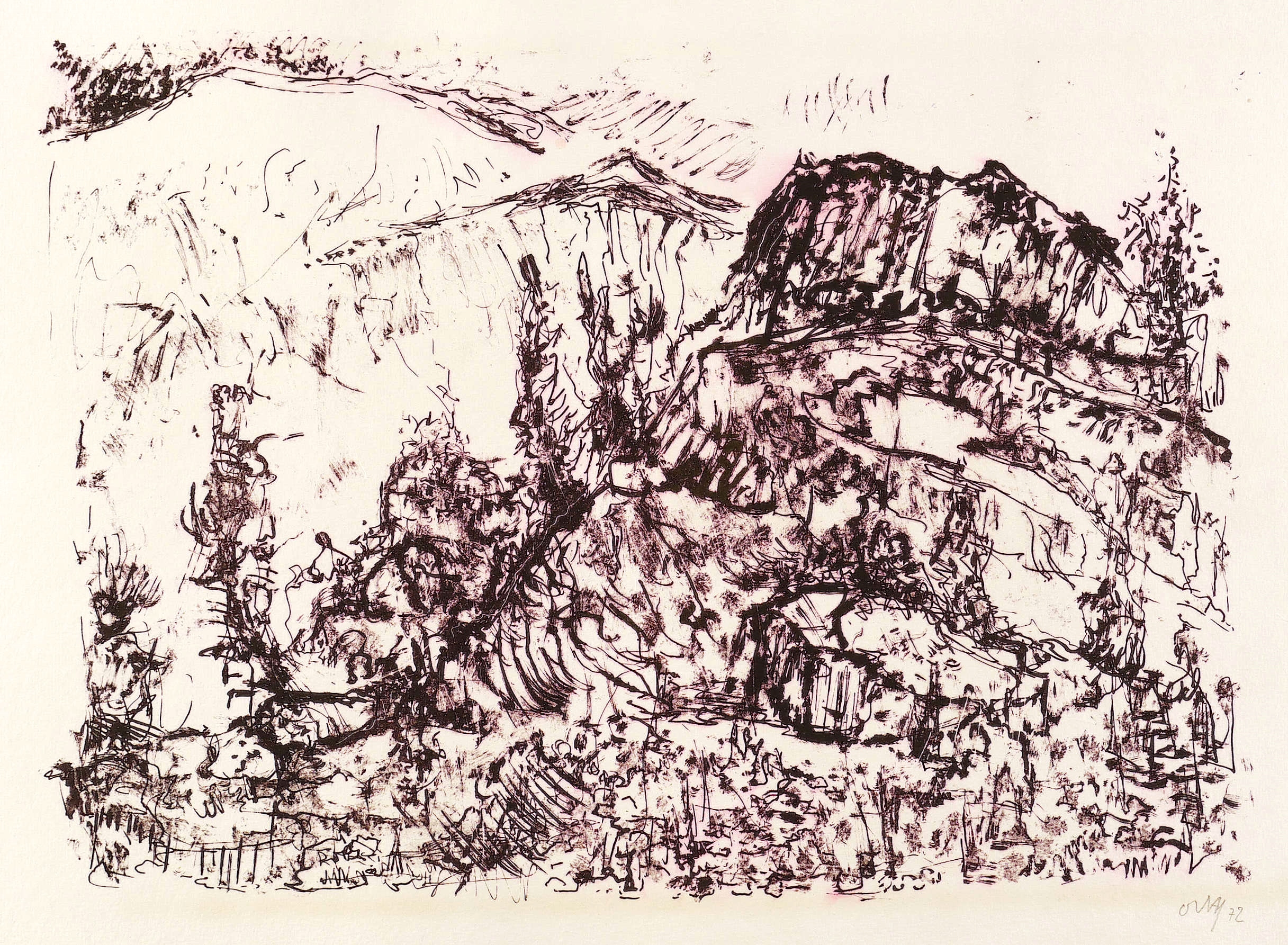 1972. Lithografie / Pinsel- & Federlithografie, in Schwarzviolett, auf hellgelbem Maschinenpapier. – Originale Künstlergrafik, von Otto Niemeyer-Holstein. – Auflage 20 Exemplare. – 32,1 x 45,2 cm (Darstellung), 45 x 60 cm (Blatt).