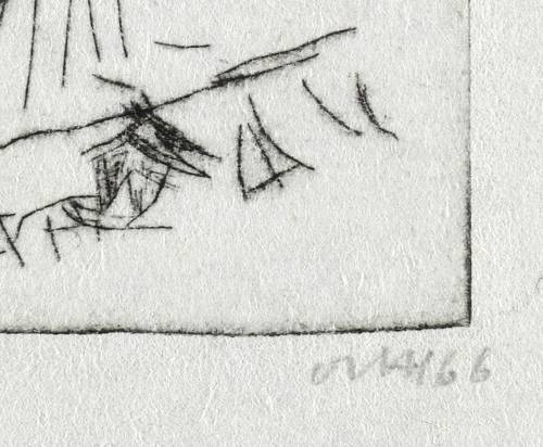 1966. Radierung / Kaltnadel, in Schwarz, auf rauem weißlichem Japanimitat. – Originale Künstlergrafik, von Otto Niemeyer-Holstein. – Auflage Exemplar Nr. 19/25. – 14,5 x 21,1 cm (Darstellung / Platte), 24 x 32 cm (Blatt).