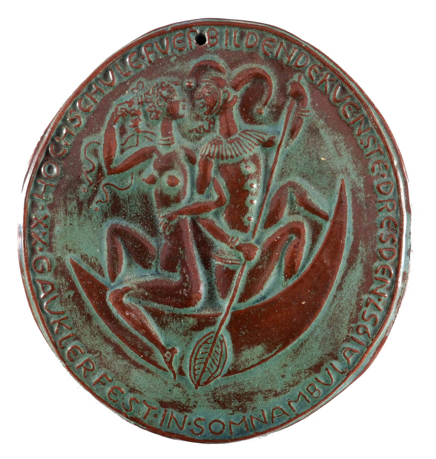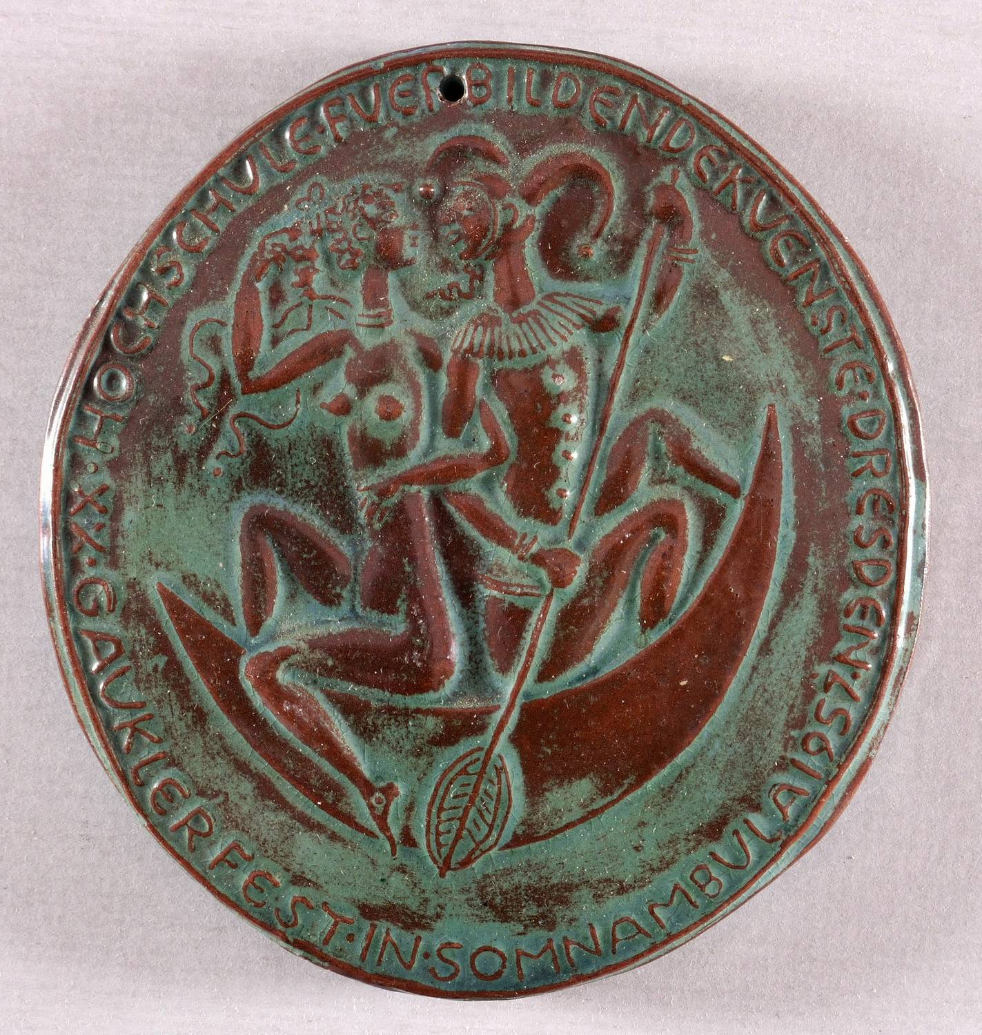 Im Rand umlaufend reliefierte Inschrift: ″XX. GAUKLERFEST IN SOMNAMBULA 1957 / HOCHSCHULE FUER BILDENDE KUENSTE DRESDEN″. – Plakette zum 20. Gauklerfest ″In Somnambula″ der Hochschule für Bildende Künste Dresden im Jahr 1957. – Sehr guter Zustand.