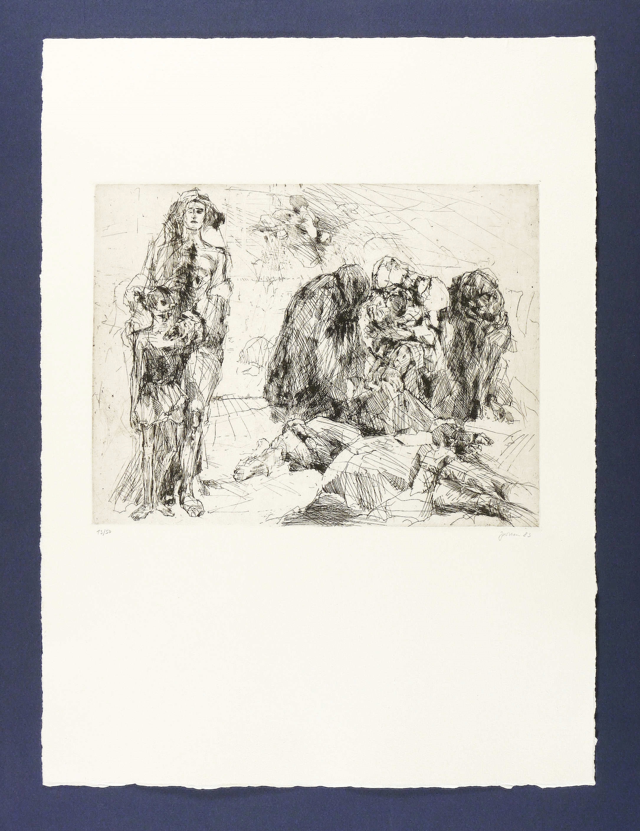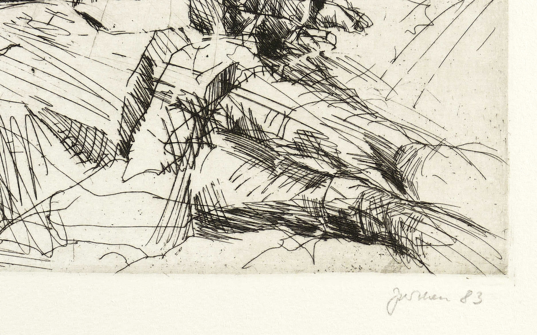 1983. Radierung / Strichätzung, mit Plattenton, in Schwarz, auf schwerem Hahnemühle-Bütten. – Originale Künstlergrafik, von Christine Perthen. – Auflage Exemplar Nr. 13/50. – 24,4 x 31,9 cm (Darstellung / Druckbild), 25,1 x 32,2 cm (Platte), 53,5 x 39,5 cm (Blatt).