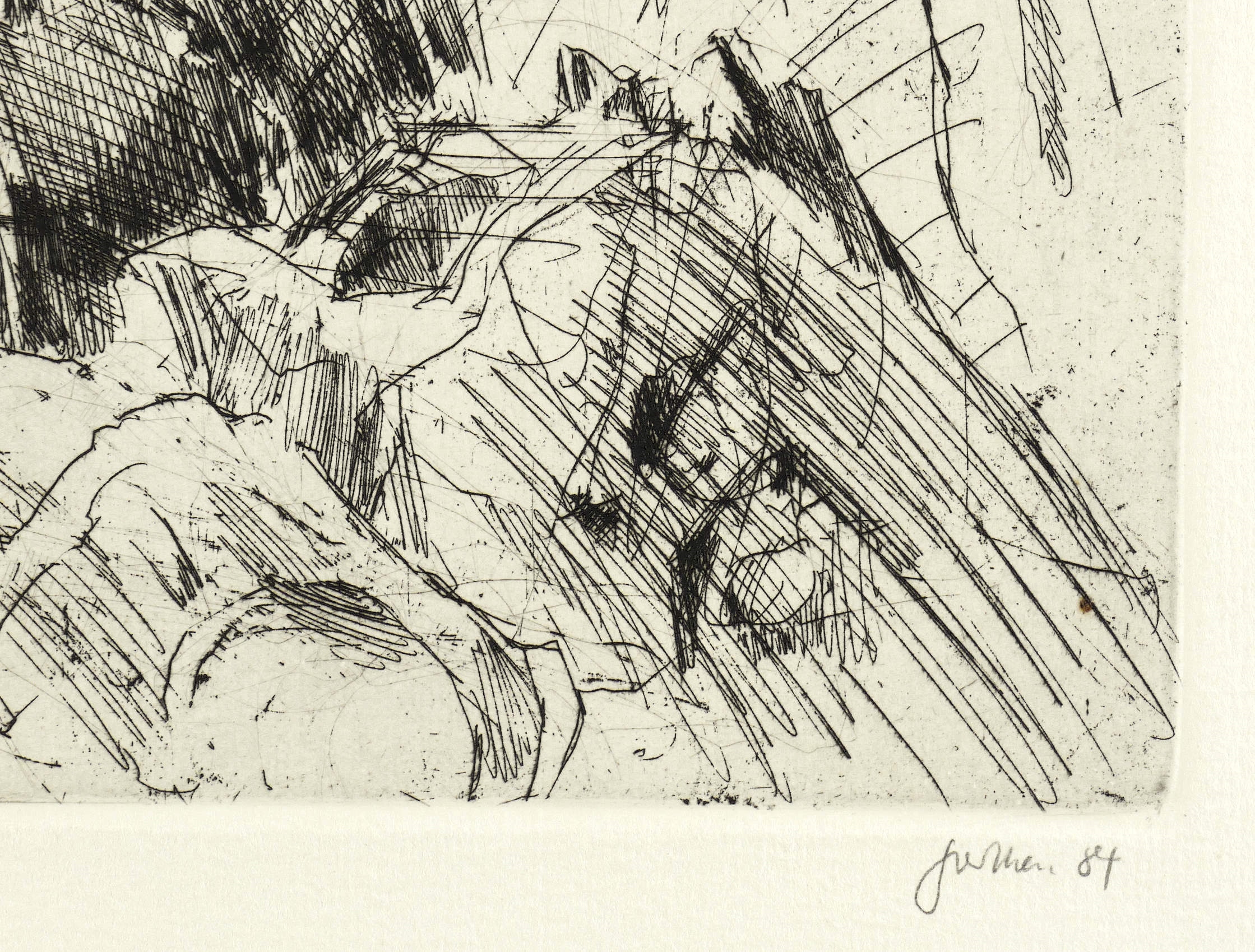 1984. Radierung / Strichätzung, mit Plattenton, in Schwarz, auf hellgelbem Karton. – Originale Künstlergrafik, von Christine Perthen. – Auflage Exemplar Nr. 51/100. – 34,8 x 29,3 cm (Darstellung / Platte), 50 x 37 cm (Blatt).