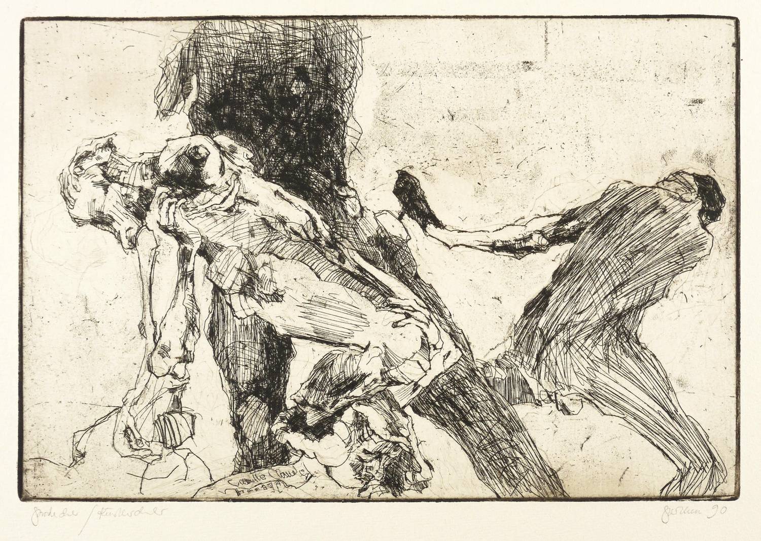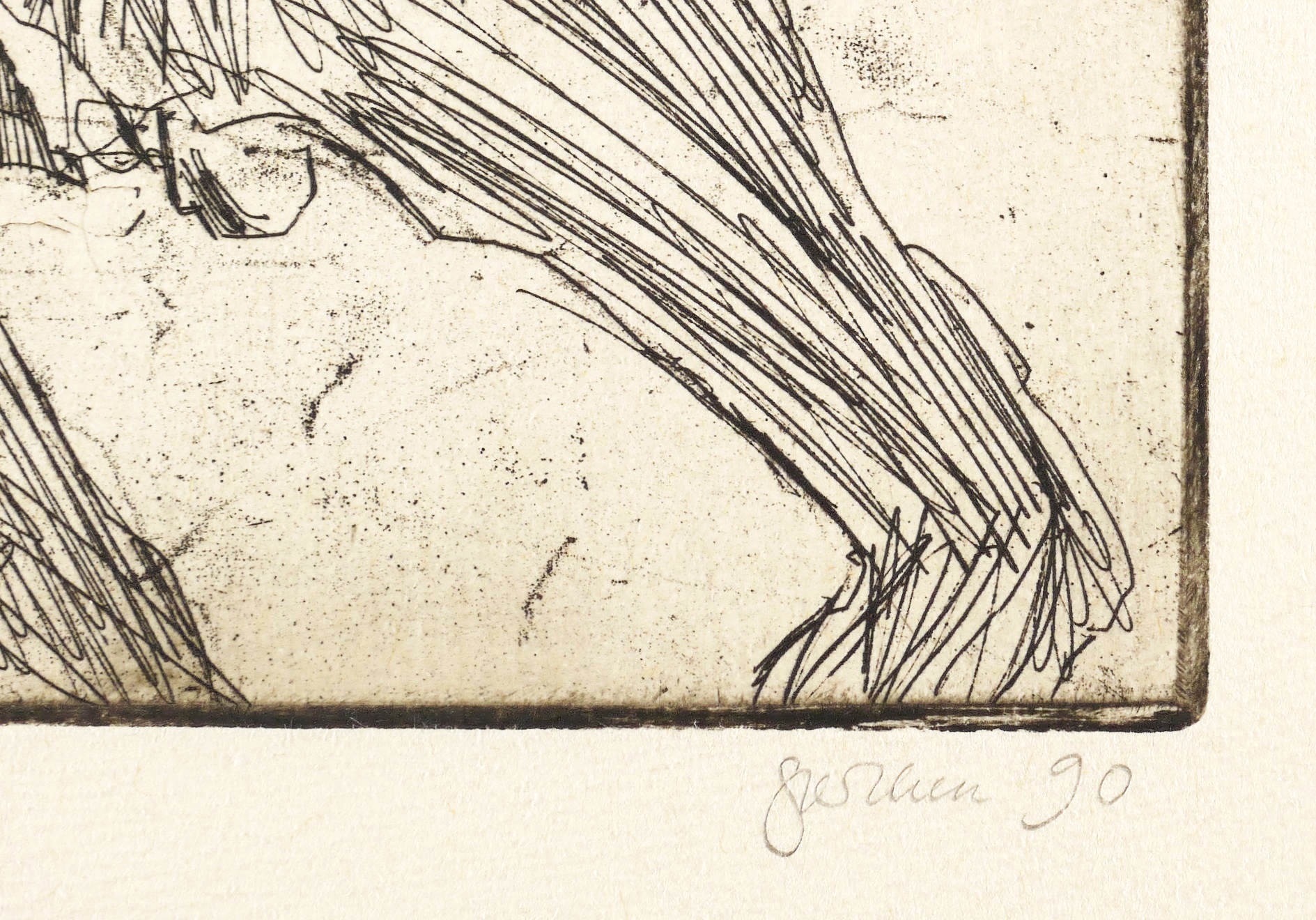 1990. Radierung / Strichätzung & Kaltnadel, in Schwarz, mit Platenton, auf chamois Hahnemühle. – Originale Künstlergrafik, von Christine Perthen. – Probedruck. – 19,3 x 28,5 cm (Darstellung / Platte), 30 x 40 cm (Blatt).