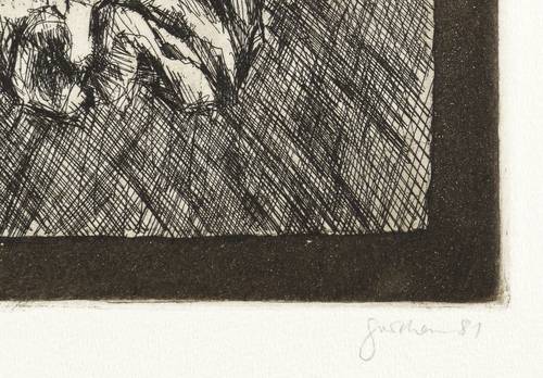 1981. Radierung / Aquatinta & Strichätzung, in Schwarz, auf weichem hellchamois Hahnemühle-Bütten. – Originale Künstlergrafik, von Christine Perthen. – Vorzugsdruck. – 32,0 x 44,5 cm (Darstellung / Platte), 37 x 49 cm (Blatt).
