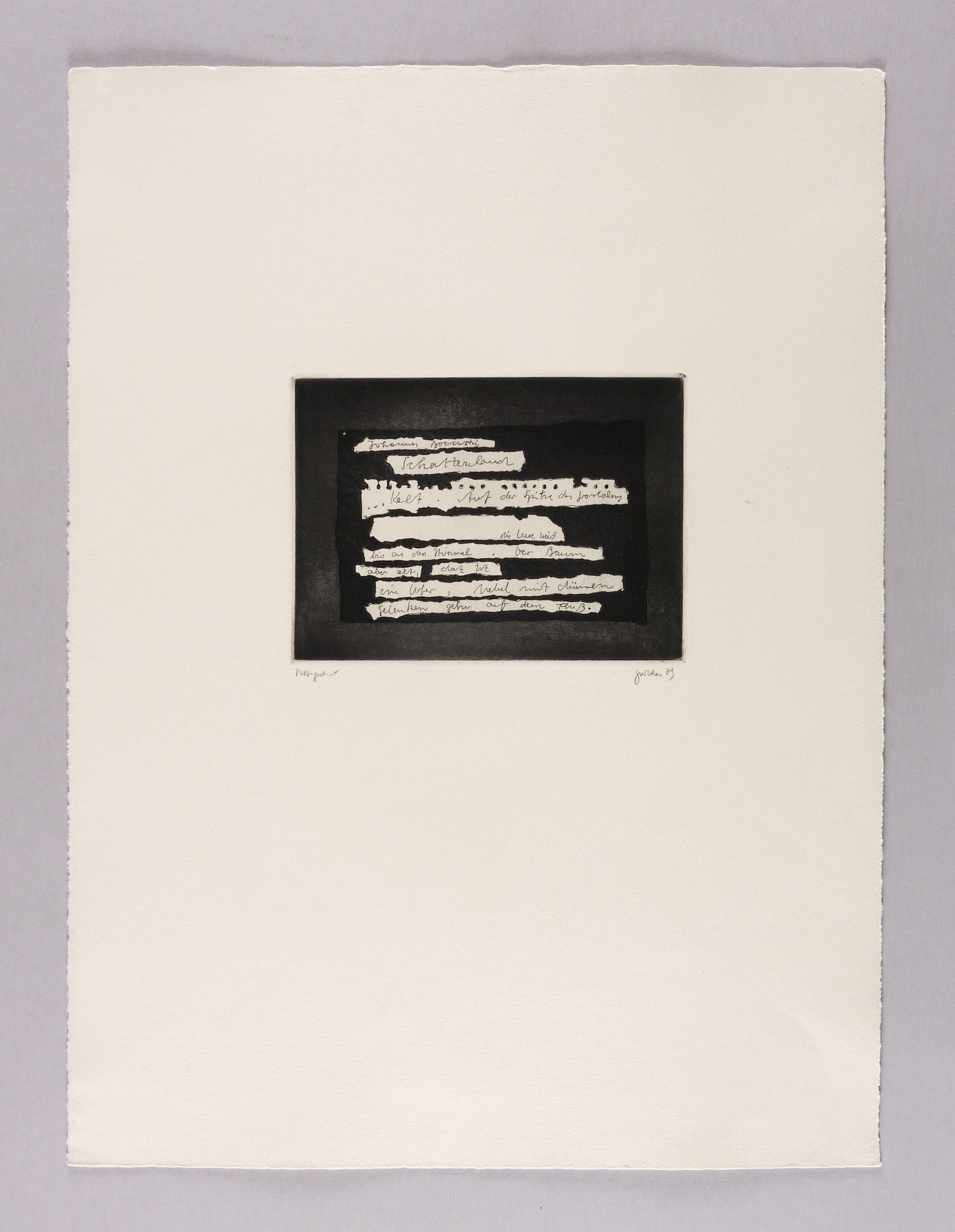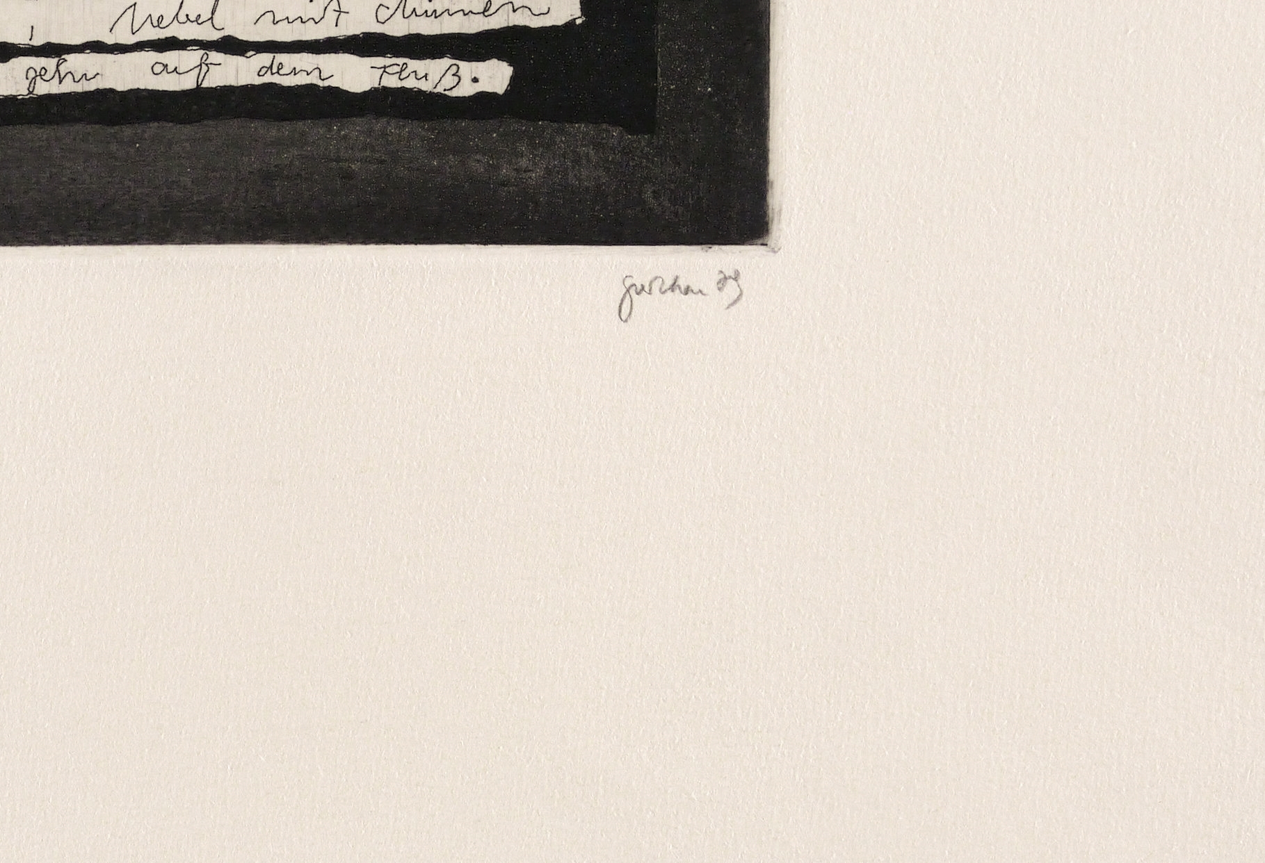 Degen C.2. Perthen. – Aus: Christine Perthen, Sieben Märkische Abendlandschaften. Zu einem Vers von Johannes Bobrowski (Berlin 1979). – Rechts unten in Bleistift signiert und datiert: ″Perthen 79″. Links eigenhändige Auflagenbezeichnung: ″Vorzugsdruck″. In der Platte Inschrift: ″Johannes Bobrowski / Schattenland / ... Kalt. Auf der Spitze des Grashalms / die Leere weiß / bis an den Himmel. Der Baum / aber alt, dort ist / ein Ufer, Nebel mit dünnen / Gelenken gehn auf dem Fluß.″ Wasserzeichen. – Titelblatt aus dem Aquatinta-Zyklus ″Sieben Märkische Abendlandschaften (zu einem Vers von Johannes Bobrowski)″ von 1979 (Verzeichnis: Andreas Degen, Johannes- Bobrowski-Bibliografie, Abt. C.2). – Sehr schwach ausgeprägtes Eselsohr links oben. Sonst frisch und ohne Makel. Insgesamt noch guter Zustand.