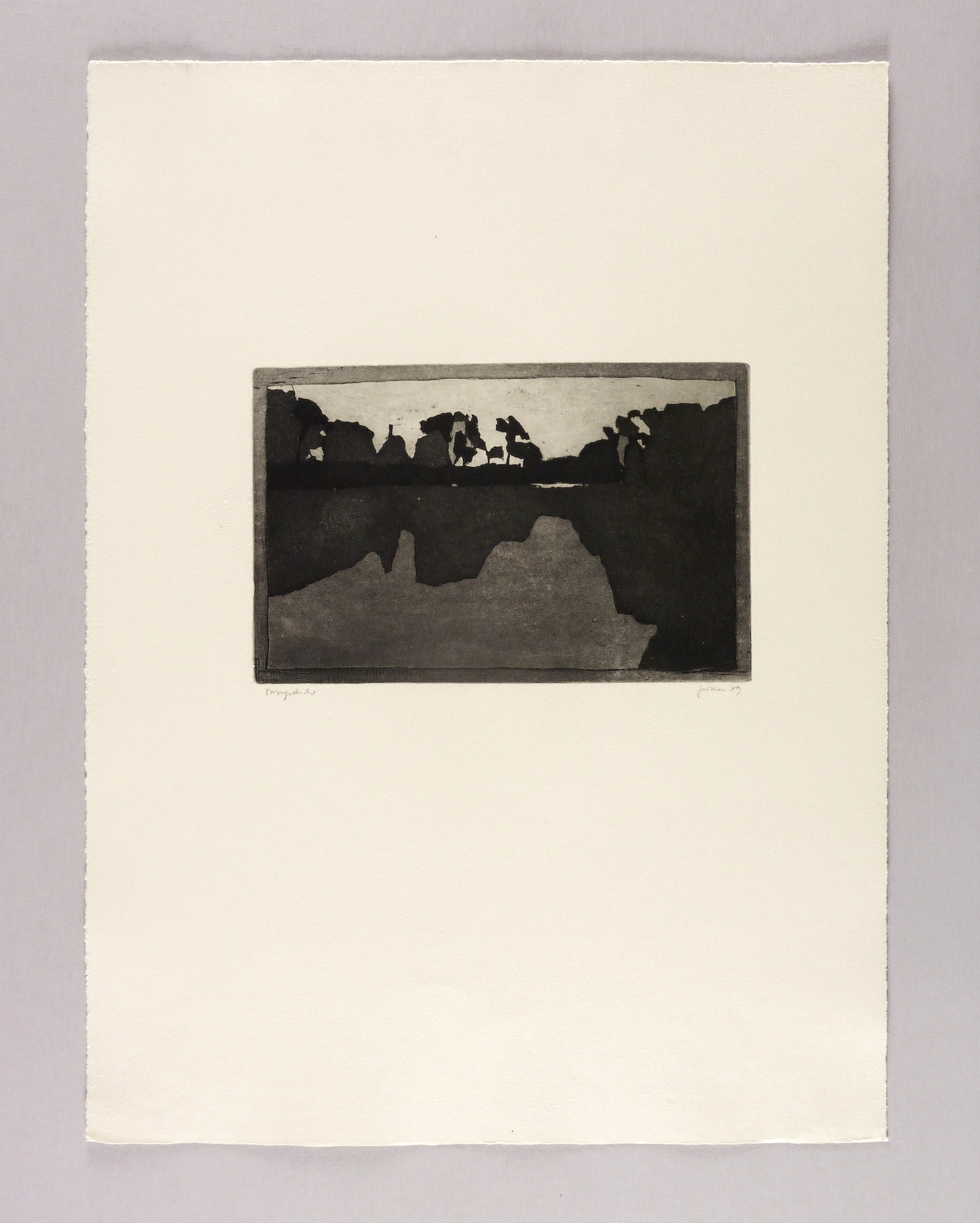 1979. Radierung / Aquatinta & Strichätzung, in Schwarz, auf schwerem chamois Hahnemühle. – Originale Künstlergrafik, von Christine Perthen. – Vorzugsdruck. – 15,8 x 24,5 cm (Darstellung / Platte), 54 x 40 cm (Blatt).