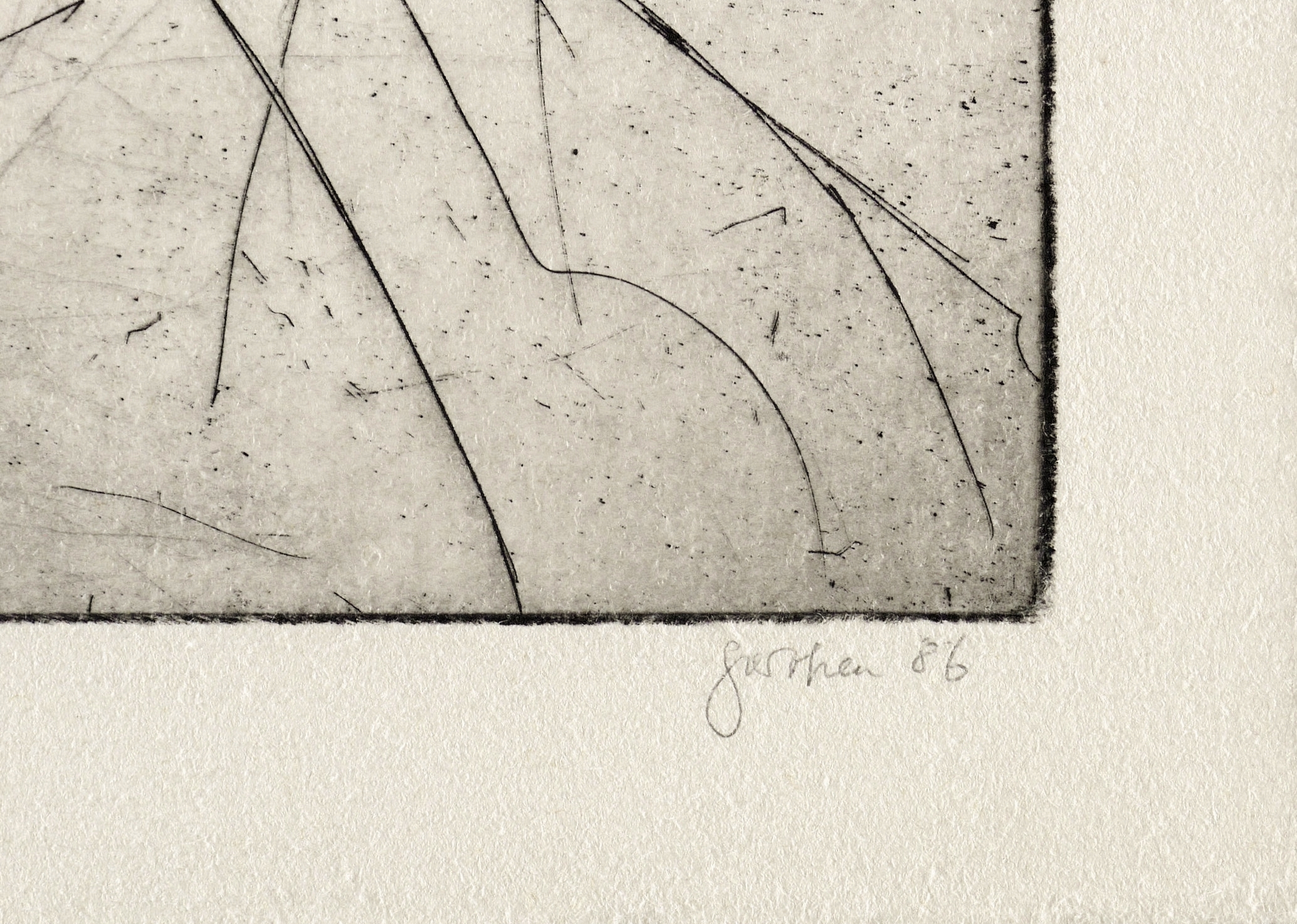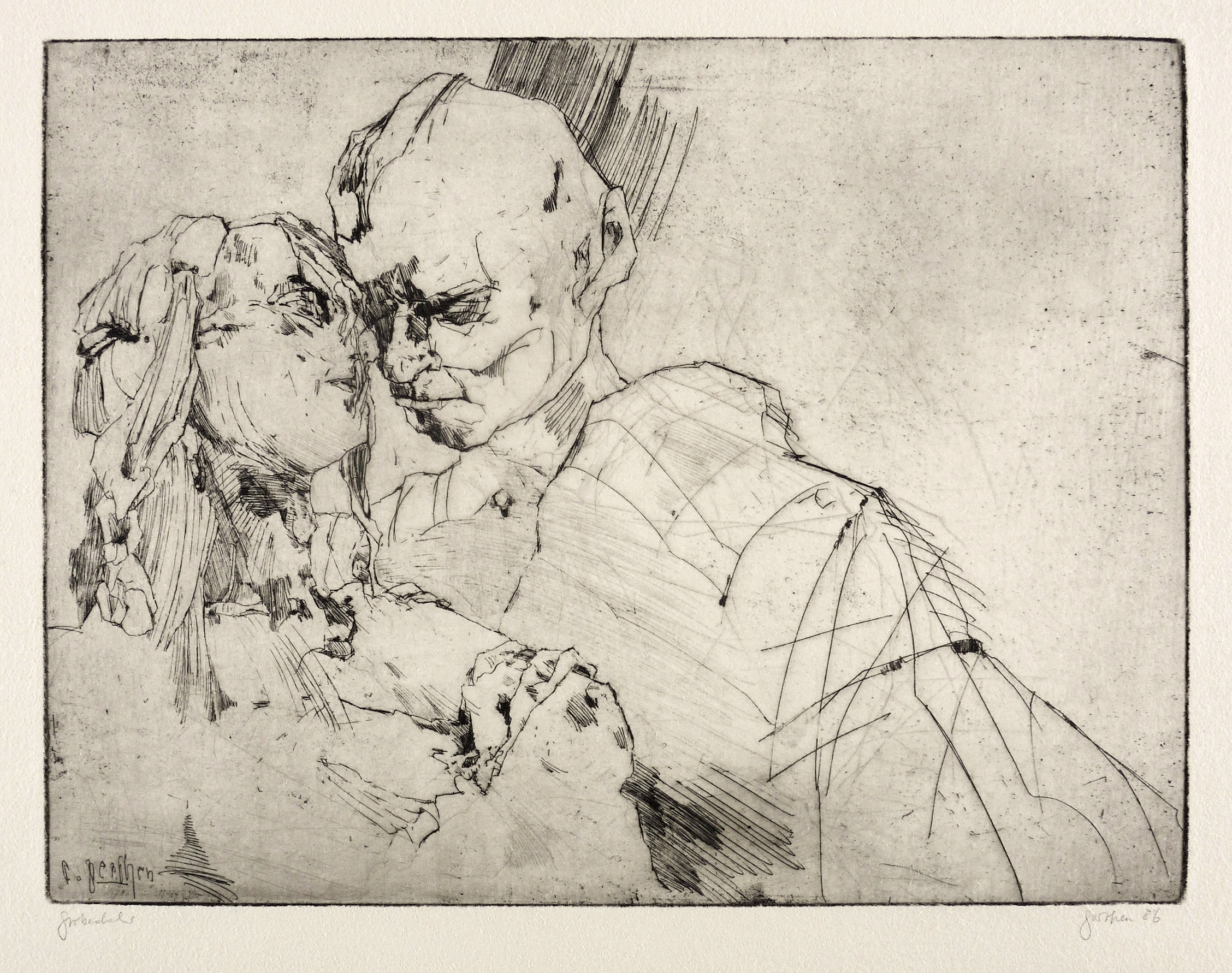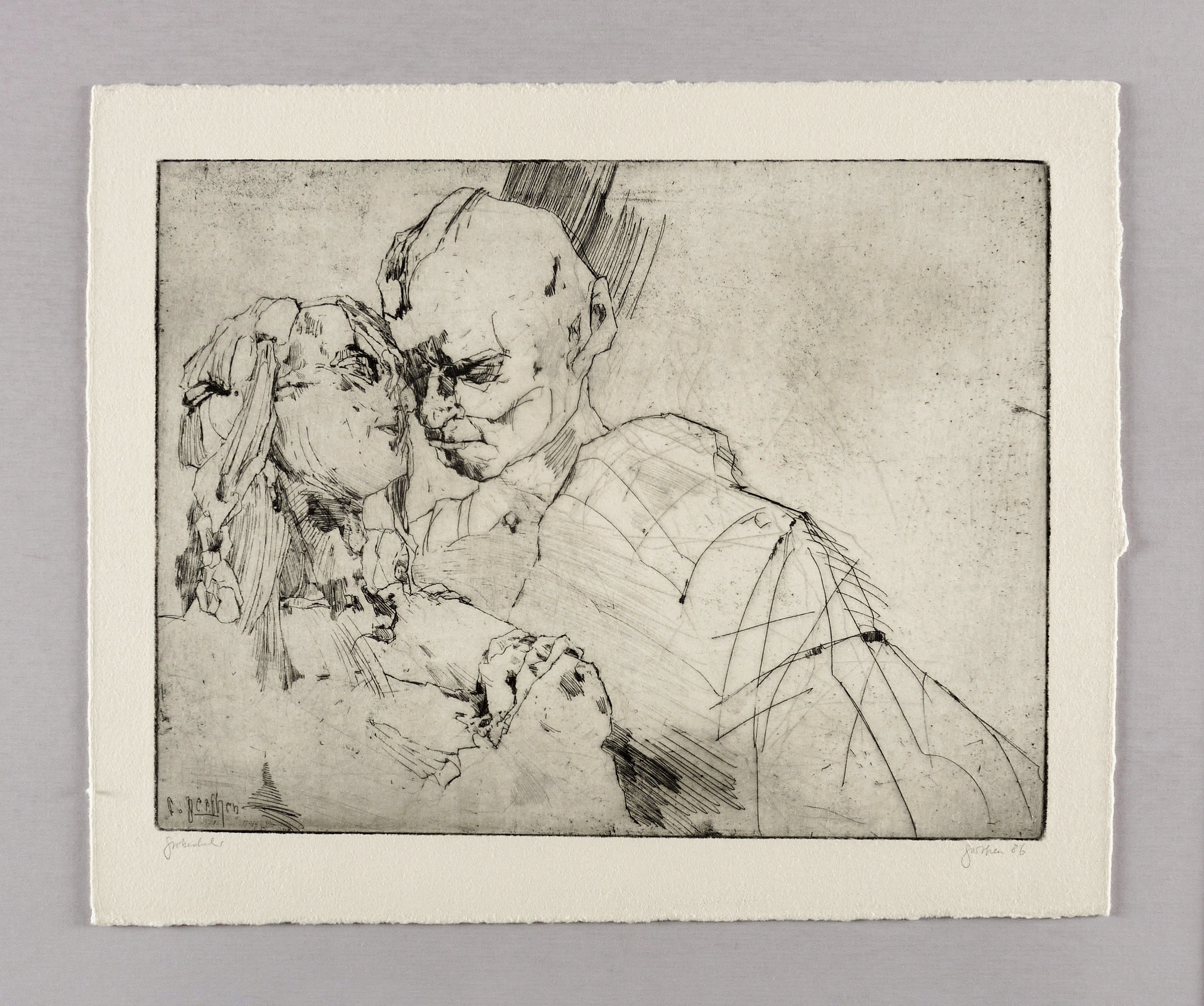 Rechts unten in Bleistift signiert und datiert: ″perthen 86″. Links Auflagenbezeichnung: ″probedruck″. In der Platte links unten Signatur: ″c. perthen″. – Probeabzug in schöner kontrastreicher Druckhaltung. – Tadelloses Exemplar. Sehr guter Zustand.