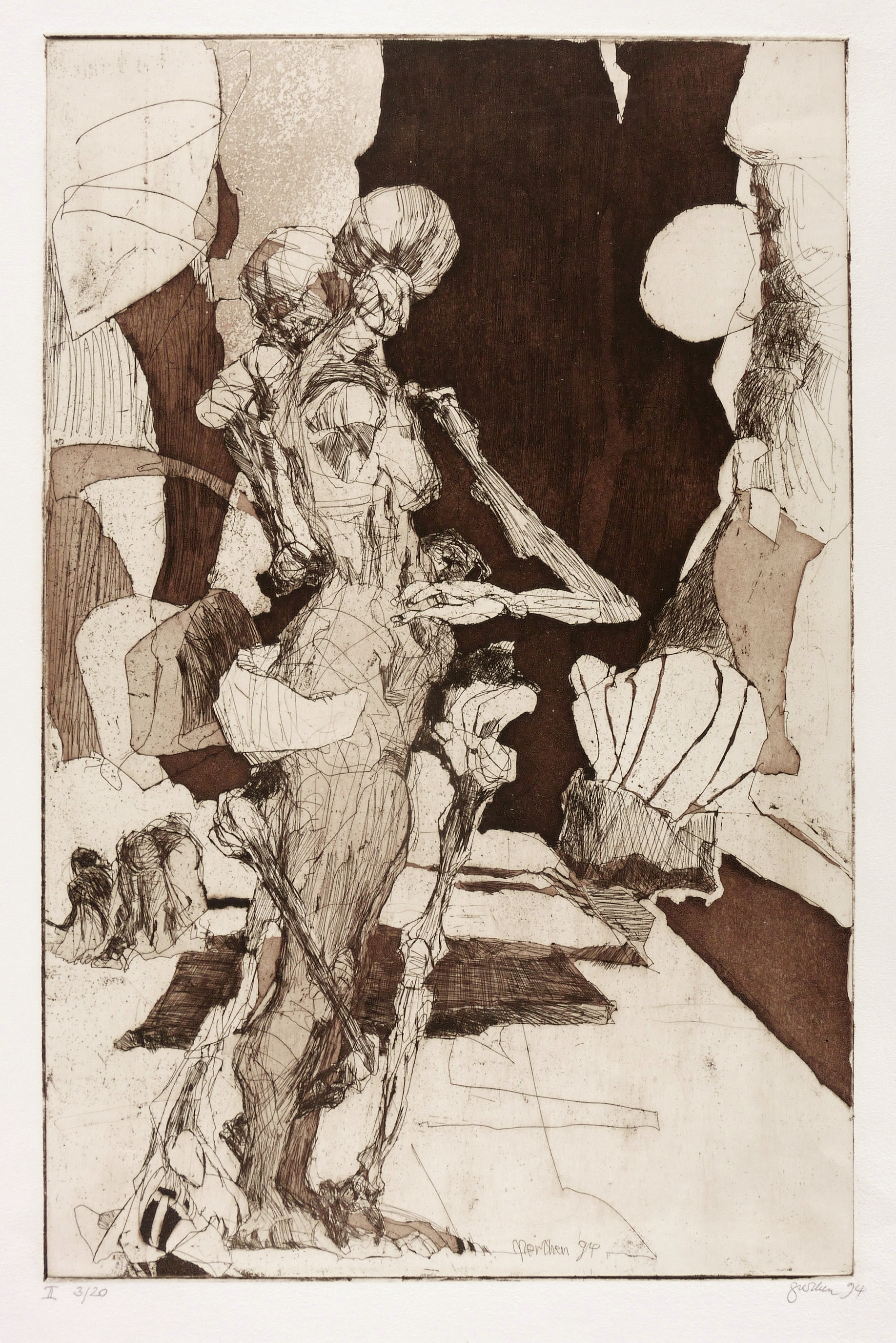 Rechts unten in Bleistift signiert und datiert: ″perthen 94″. Links Auflagenbezeichnung: ″II 3/20″. Verso Titel und Signatur: ″vor dunkler wand / perthen″. Dazu Widmung der Künstlerin. In der Platte unten nochmals Signatur und Jahr: ″perthen 94″. – Stehender Frauenakt im Profil, abgewandt und vom Tod umschlungen. – Sehr guter Zustand.