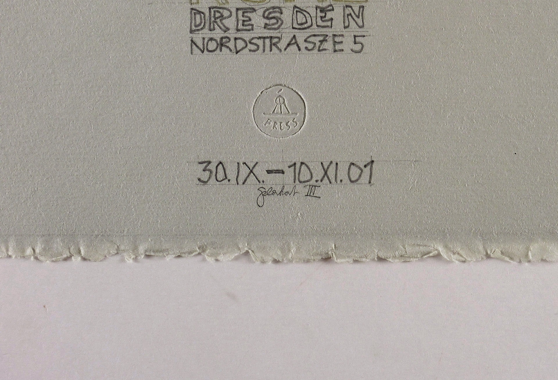 Nicht handsigniert. Inschriften in Bleistift. Dazu unterhalb bezeichnet: ″plakat III″. Trockenstempel des Druckers oder der Grafikpresse. – Unikater Entwurf für ein Ausstellungsplakat zur Ausstellung von Christine Perthen in der Galerie Kunstausstellung Kühl in Dresden 30.9.-10.11.2001. – Überarbeitung einer Radierung von 1993. – Sehr guter Zustand.