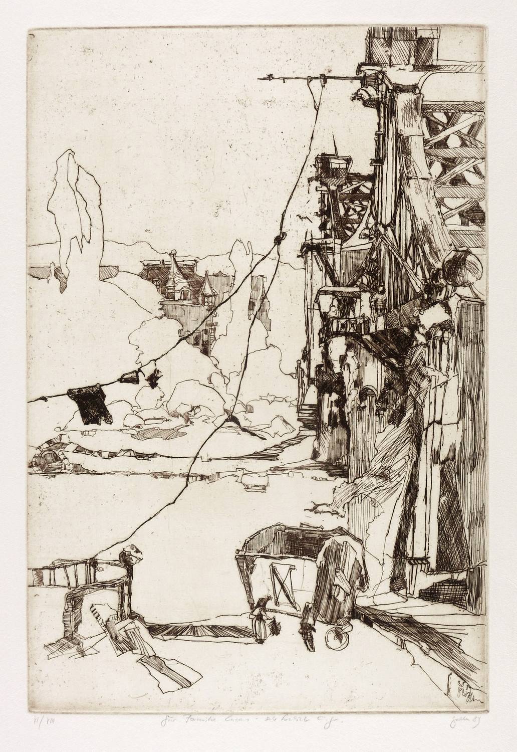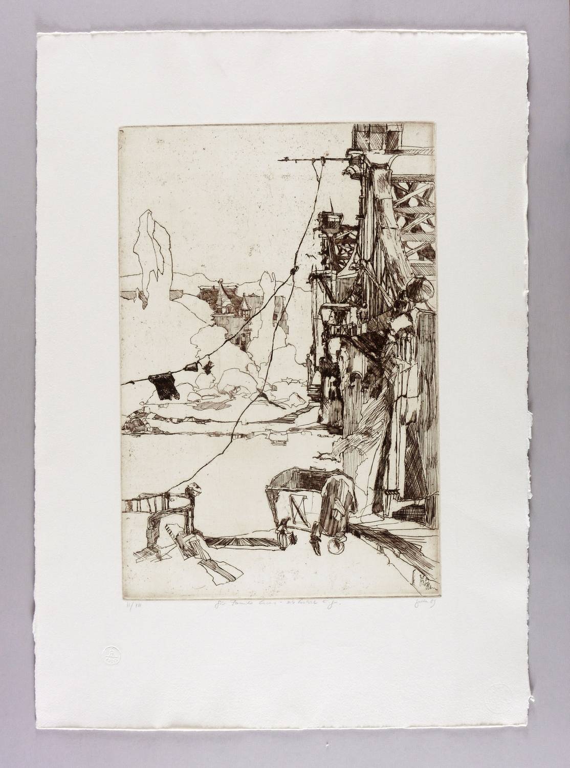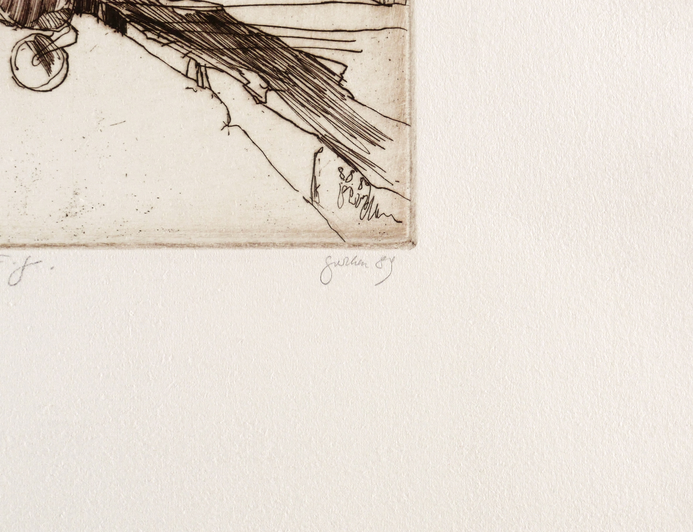 1989. Radierung / Strichätzung, in Schwarzbraun, auf kräftigem hellchamois Hahnemühle. – Originale Künstlergrafik, von Christine Perthen. – Auflage Exemplar Nr. VI/VIII. – 47,7 x 32,0 cm (Darstellung / Platte), 70 x 50 cm (Blatt).