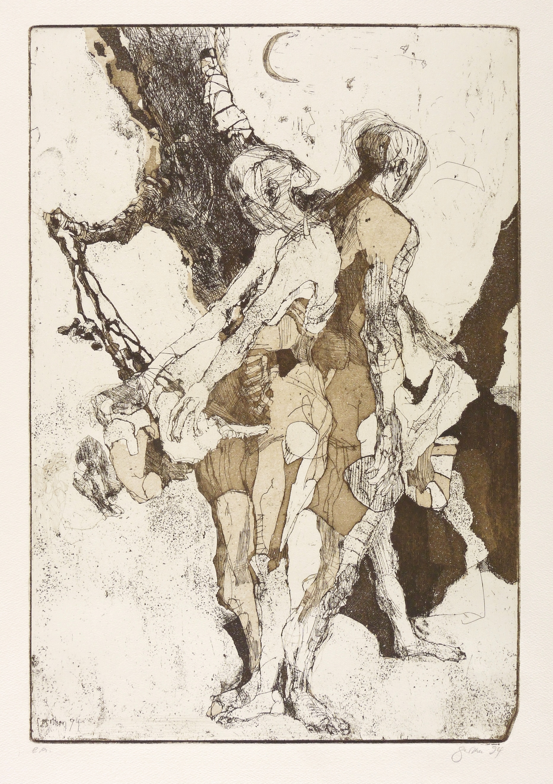 Rechts unten in Bleistift signiert und datiert: ″Perthen 94″. Links Auflagenbezeichnung: ″e.a.″ In der Platte links unten nochmals Signatur und Jahr: ″C. Perthen 94″. Verso Titel: ″MANN UND FRAU VOR DUNKLEM BAUM″. Dazu diverse Ausstellungs-Nr. sowie Widmung der Künstlerin. Wasserzeichen der Hahnmühle. – Sehr guter Zustand.