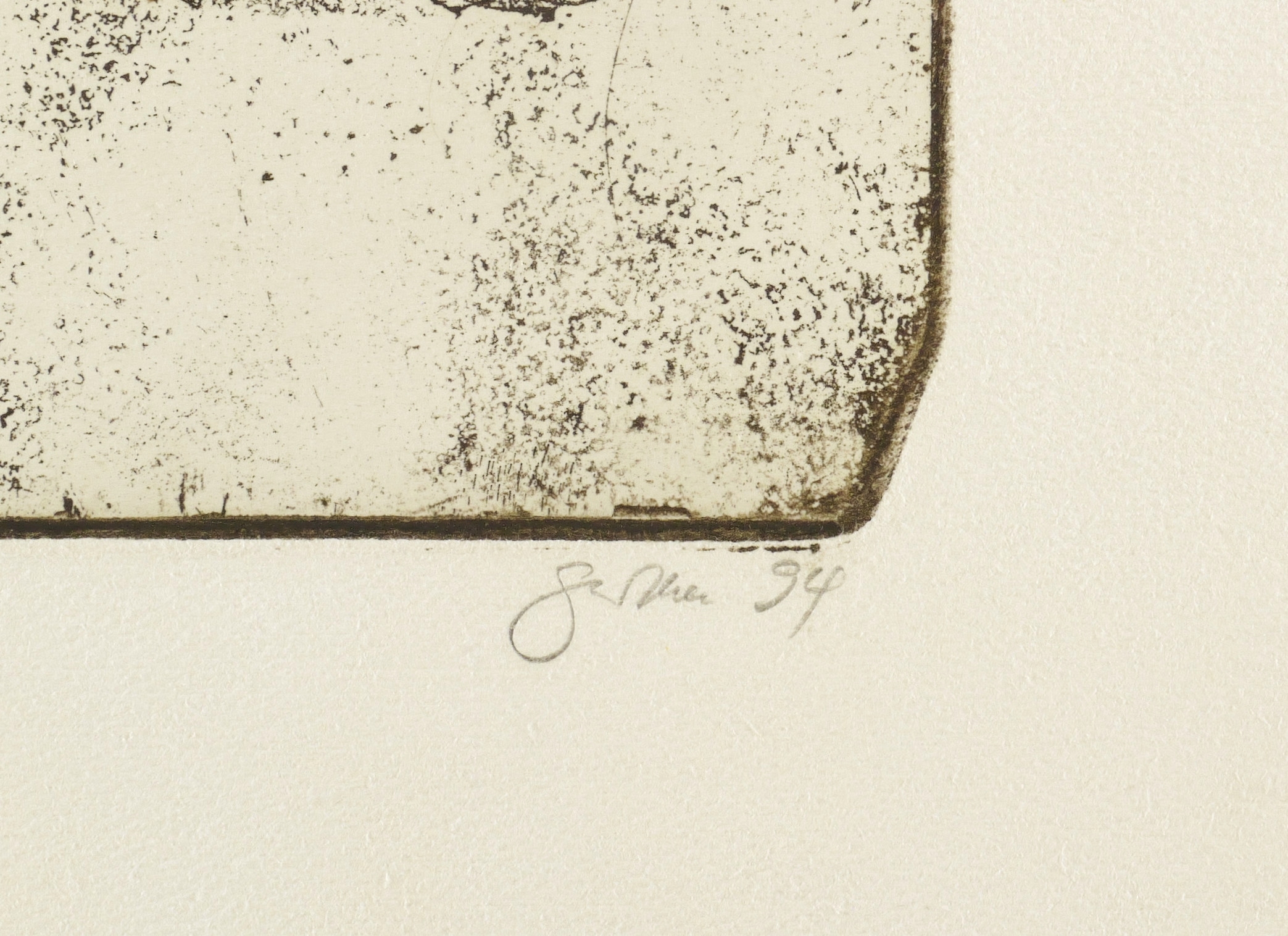 1994. Radierung / Vernis mou, Strichätzung, Aquatinta & Kaltnadel, in Schwarzbraun, auf schwerem hellchamois Hahnemühle. – Originale Künstlergrafik, von Christine Perthen. – Künstlerexemplar (e.a.). – 42,7 x 29,3 cm (Darstellung / Platte), 54 x 40 cm (Blatt).