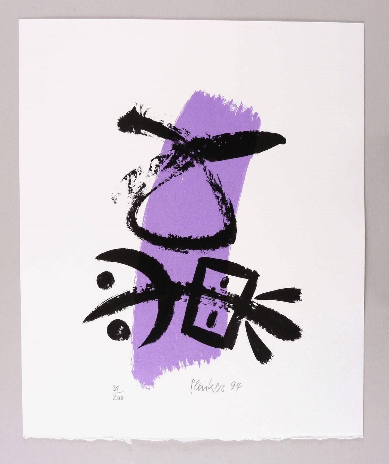 1994. Farblithografie / Pinsellithografie, in Violett & Schwarz, auf festem hellem Velin. – Originale Künstlergrafik, von Stefan Plenkers. – Auflage Exemplar Nr. 31/200. – 36,6 x 27,3 cm (Darstellung / Druckbild), 51 x 43 cm (Blatt).