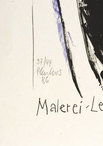 Links unten in Bleistift signiert und datiert: ″Plenkers 86″. Darüber Auflagenbezeichnung: ″37/44″. Im Stein unterhalb der Darstellung Inschrift. – Originalgrafisches Plakat zur Ausstellung ″S.P. - Malerei″ im Leonhardimuseum in Dresden-Loschwitz Juni-Juli 1986. – Provenienz: Sammlung Dr. Ingrid und Prof. Dr. Albrecht Scholz, Dresden. – Sehr guter Zustand.