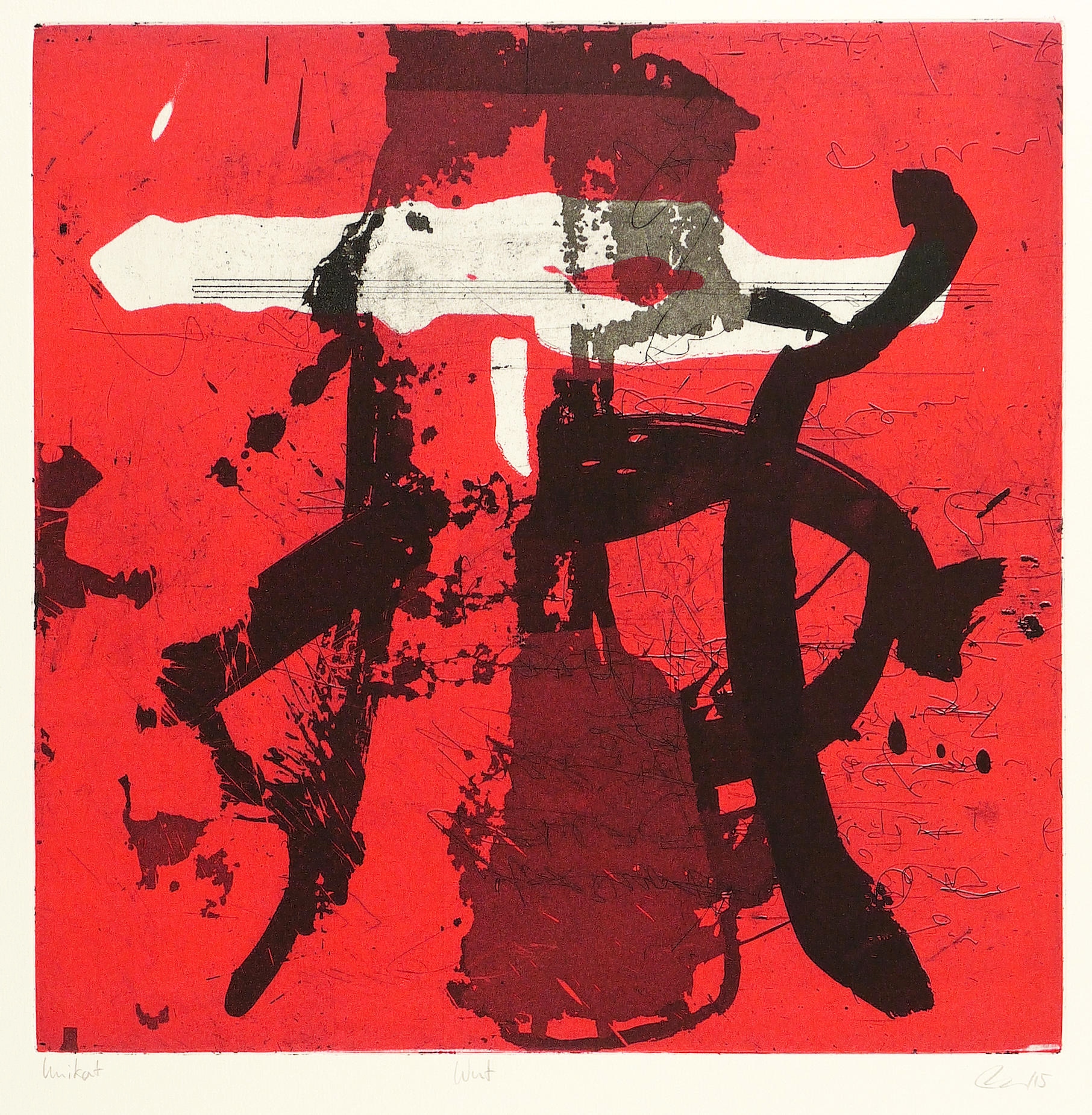 2015. Farbradierung / Strichätzung & Aquatinta, in Rot & Schwarz, auf Büttenkarton. – Originale Künstlergrafik, von Tanja Pohl. – Unikat. – 29,5 x 29,5 cm (Darstellung / Platte), 63 x 46 cm (Blatt).