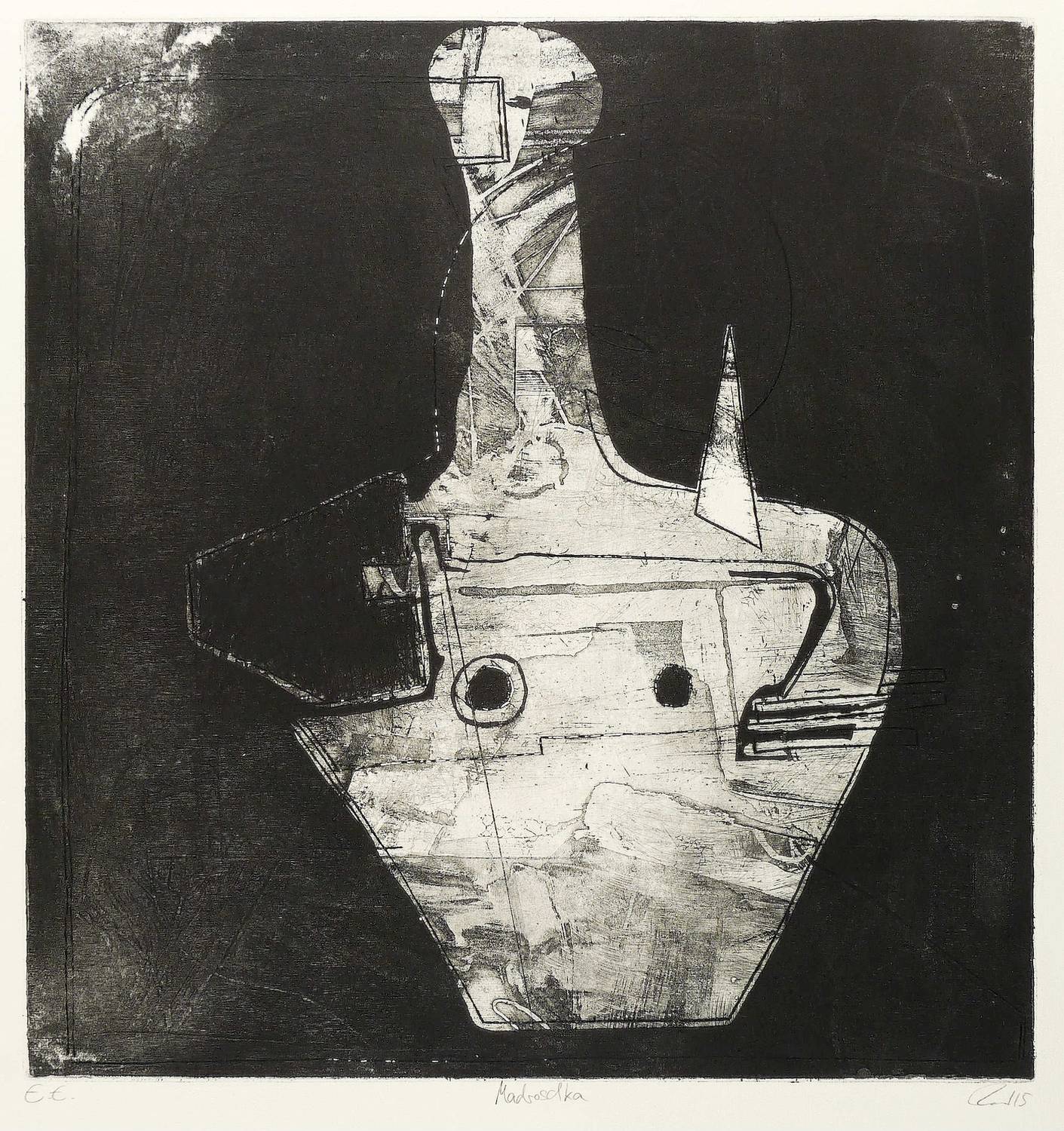 2015. Radierung / Strichätzung, Aquatinta & Reservage, mit Prägedruck, in Schwarz, auf Büttenkarton. – Von Tanja Pohl. – Künstlerexemplar (e.a.). – 49,5 x 46,5 cm (Darstellung / Platte), 56 x 54 cm (Blatt).