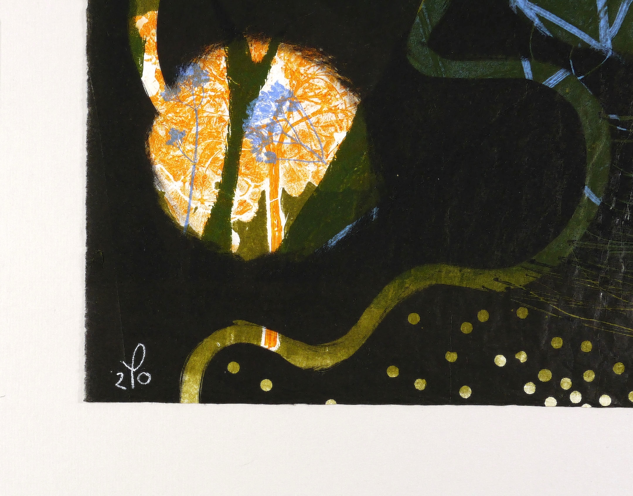 2020. Mischtechnik / Farbmonotypie & Pflanzendruck, auf Chinapapier. – Originale Künstlergrafik, von Tanja Pohl. – Unikat. – 96,0 x 71,0 cm (Darstellung / Blatt).
