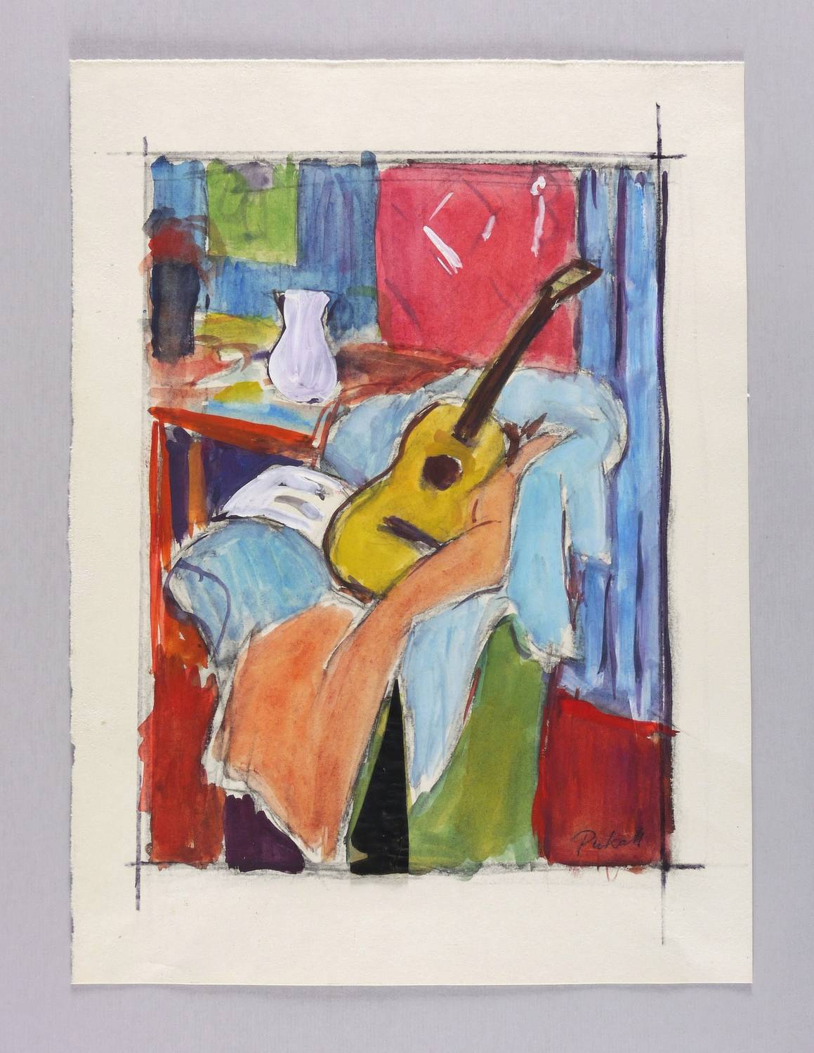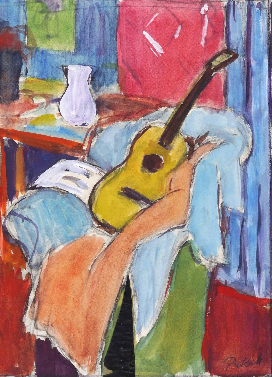 Rechts unten signiert: ″Pukall″. – Vergleiche das Motiv in leichter Abwandlung bei den zwei Gemälden ″Gitarrenstillleben″ und ″Gitarrenstillleben II″ von 1976 (WVZ Walther-Pukall Nr. 190 und 191). – Sehr guter Zustand.