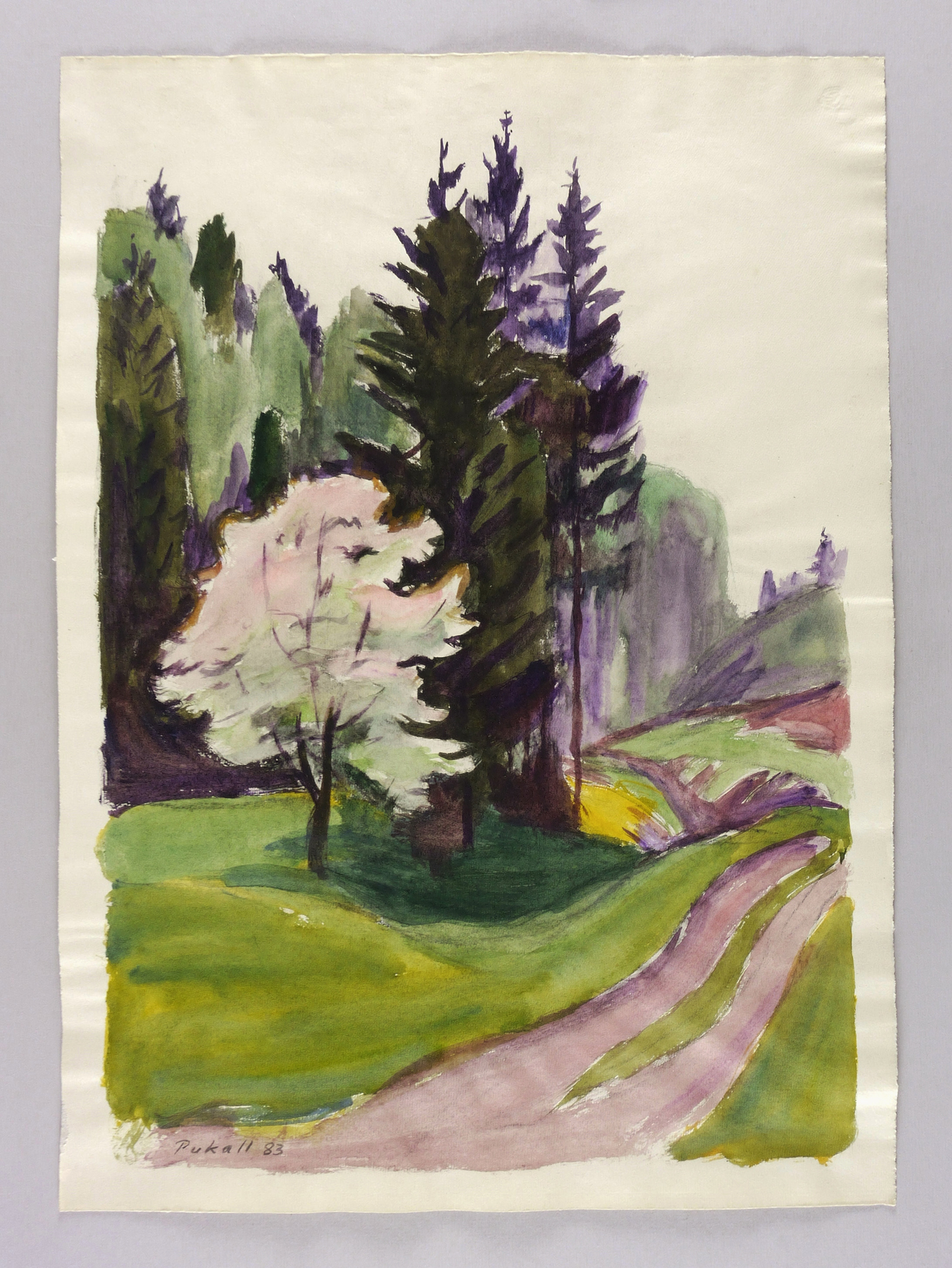 Links unten in Tusche signiert und datiert: ″Pukall 1983″. – Landschaft bei der sogenannten Plinzmühle in Plinz, heute Milda, im thüringischen Saale- Holzland-Kreis. – Sehr guter Zustand.