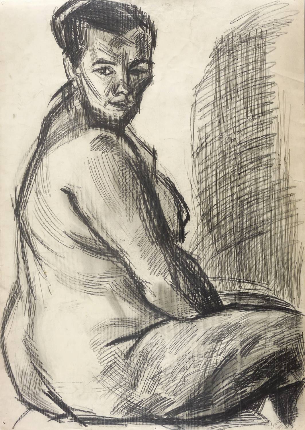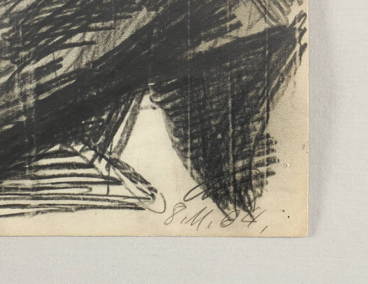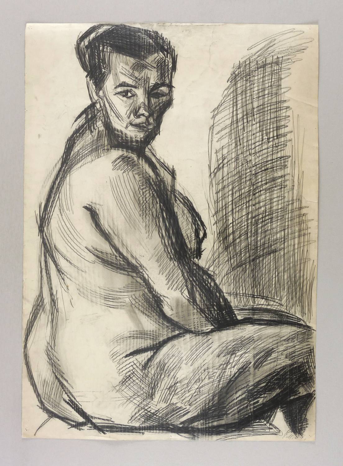 Dittrich C 463. – Rechts unten in Bleistift signiert und datiert: ″Qu. 8.11.64″. Verso eigenhändiges Qualitätssigel ″XOOX″. Dazu Titel: ″(Der Berg) Weibl. Akt″. – Im Blattrand herstellungsbedingt diverse Reißzwecklöchlein. Randriss rechts fachgerecht geschlossen. Insgesamt doch guter Zustand.