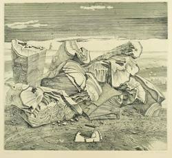 Günter Richter (*1933 Meißen, lebt und arbeitet in Leipzig). Deutscher Maler und Grafiker. 1949-53 Ausbildung zum Bossierer in der Staatlichen Porzellanmanufaktur in Meißen. 1953-58 Studium an der Hochschule für Grafik und Buchkunst in Leipzig (HGB). 1972 Mitbegründer der Leipziger Grafikbörse, 1976-82 Leitung. 1989-92 Lehrer im Jugendstudio des Lindenau-Museums Altenburg. Seit 1990 Dozent an der HGB Leipzig. Ob in Form von zerfallenen Hausfassaden, welkenden Blumen oder Strandgut, Zeit und Verfall ist zentrales Thema fast seines gesamten Werks, das eine surreal verfremdete Romantik kennzeichnet.