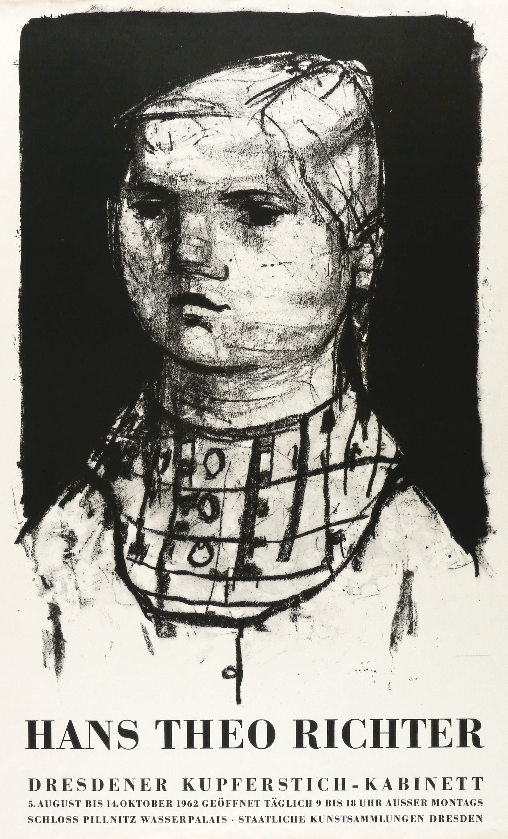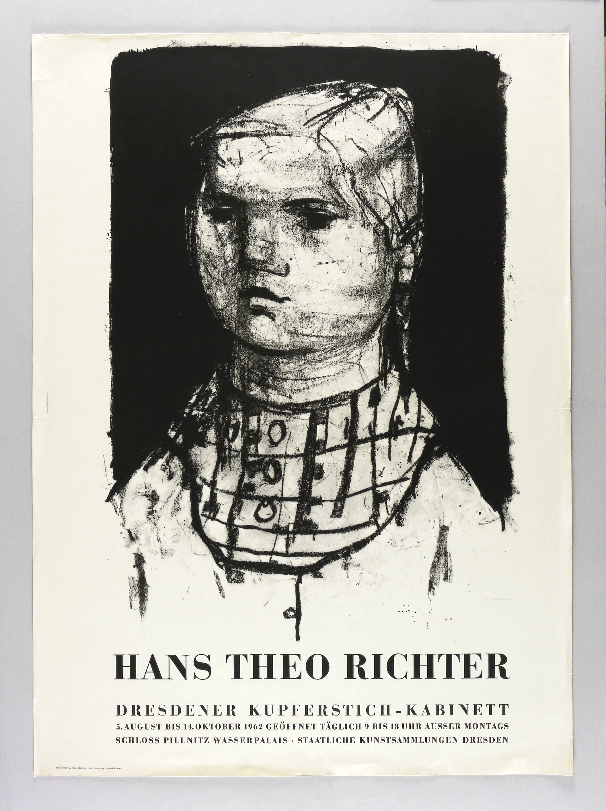 Nicht handsigniert. Unterhalb typografischer Text. – Künstlerplakat zur Ausstellung ″Hans Theo Richter″ des Kupferstich-Kabinett der Staatlichen Kunstsammlungen Dresden im Wasserpalais Pillnitz 5.8.-14.10.1962. - Gestaltung des Plakats durch Gerhard Kettner. – Papier durchgehend leicht knickspurig. Blattkanten etwas bestoßen. Zahlreiche Randrisse hinterlegt. Mangelhafter bis mäßig guter Zustand.